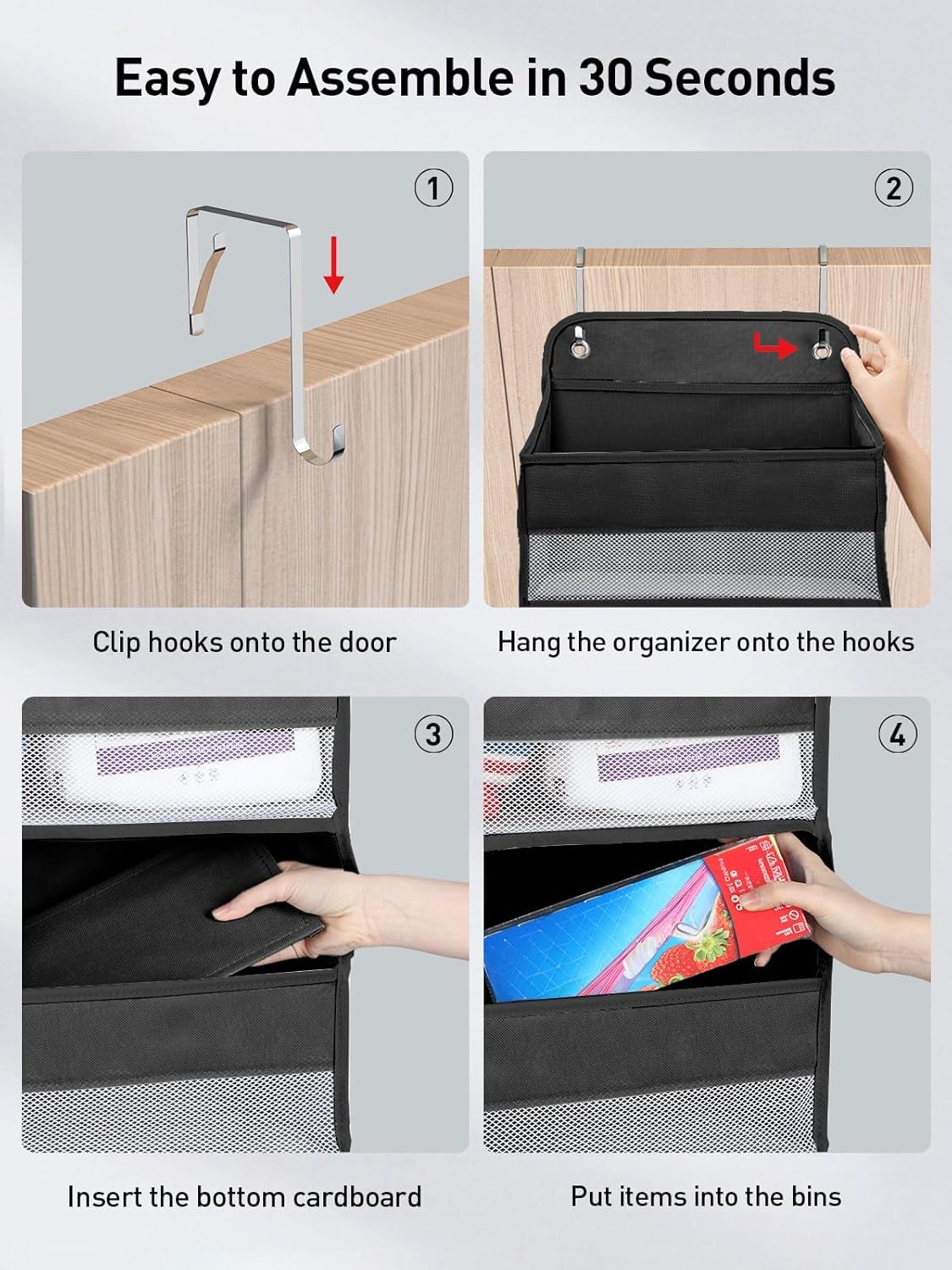 - Easy Assembly, No Hassle: Unlike other brands' door hanging organizer bedroom that comes with piles of cardboard that need complicated manual assembly, Our over the door storage comes pre-inserted with cardboard in the pockets, giving you a tool-free assembly within seconds. Simply hang the hooks over the door, then hang the over door storage, insert 5 cardboard bottoms, and you're ready to go
