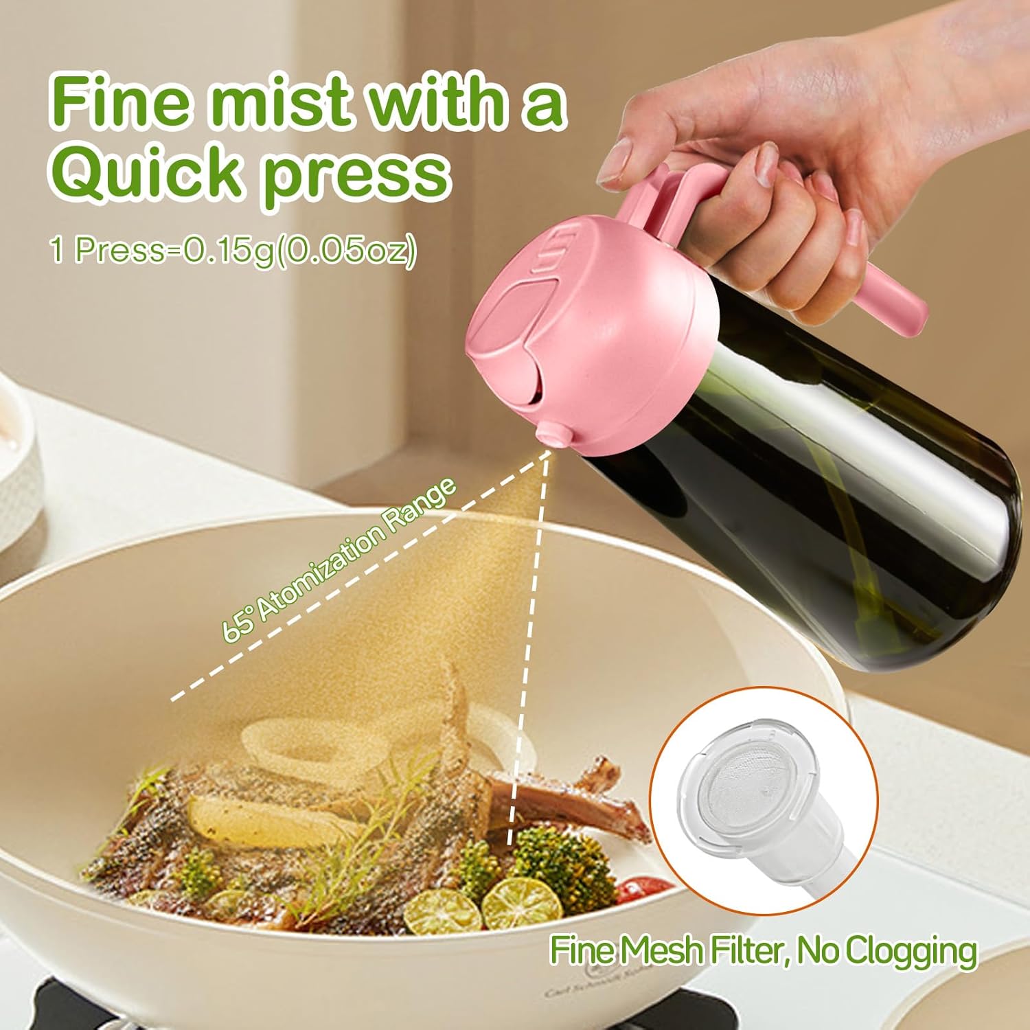 - 【Precise Oil Control】: 2 in 1 oil dispenser and oil sprayer can help to control the amount of oil while pouring or spraying. Each spray dispenses approximately 0.2 grams of oil, which is easily to control and measure your daily oil intake
