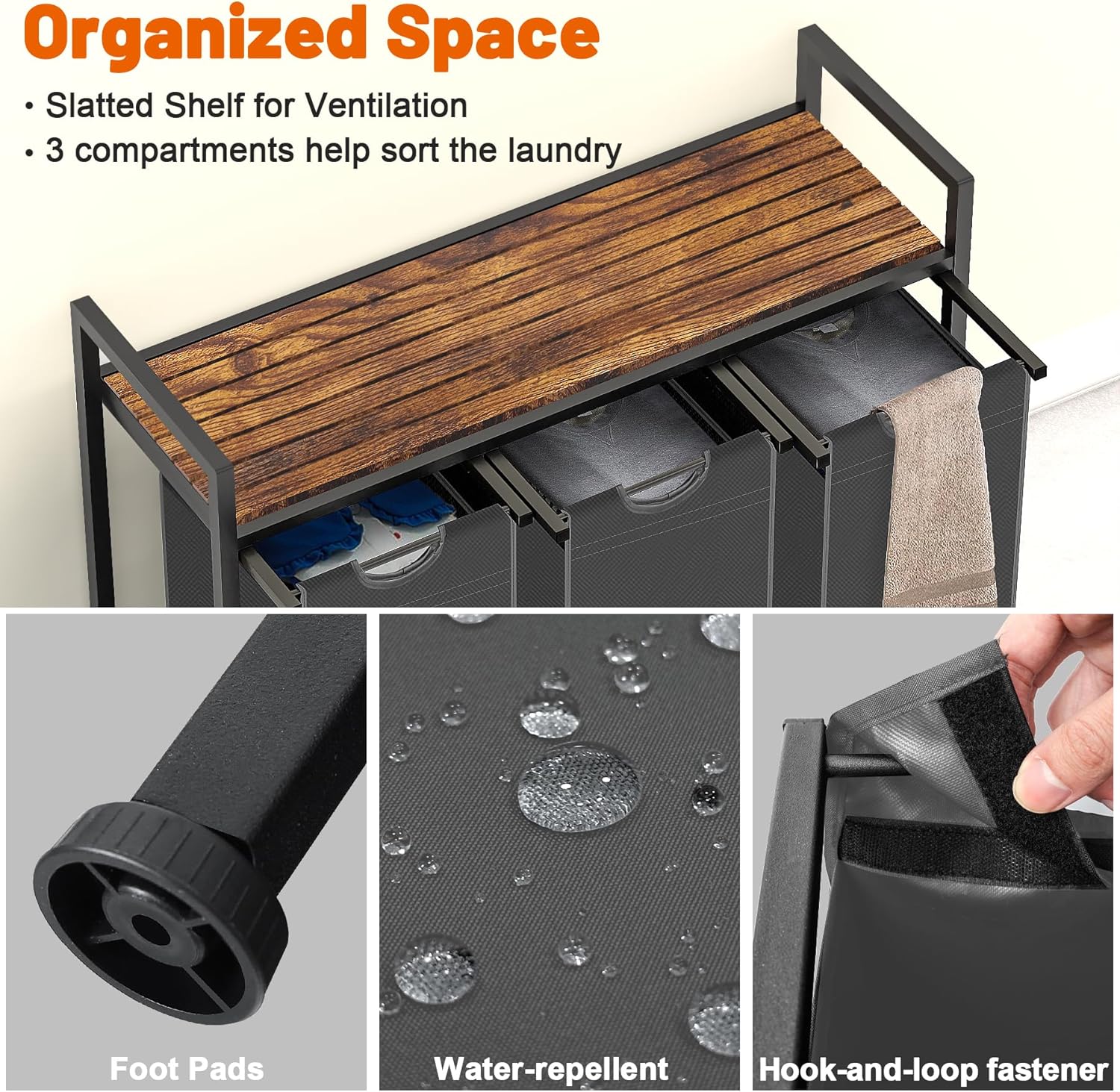 - 3 Removable Bags - The laundry hamper has a total capacity of 30 gallons, with each liner holding 10 gallons. Its 3 compartment design enables you to organize your laundry by type and separate light laundry from different family members.