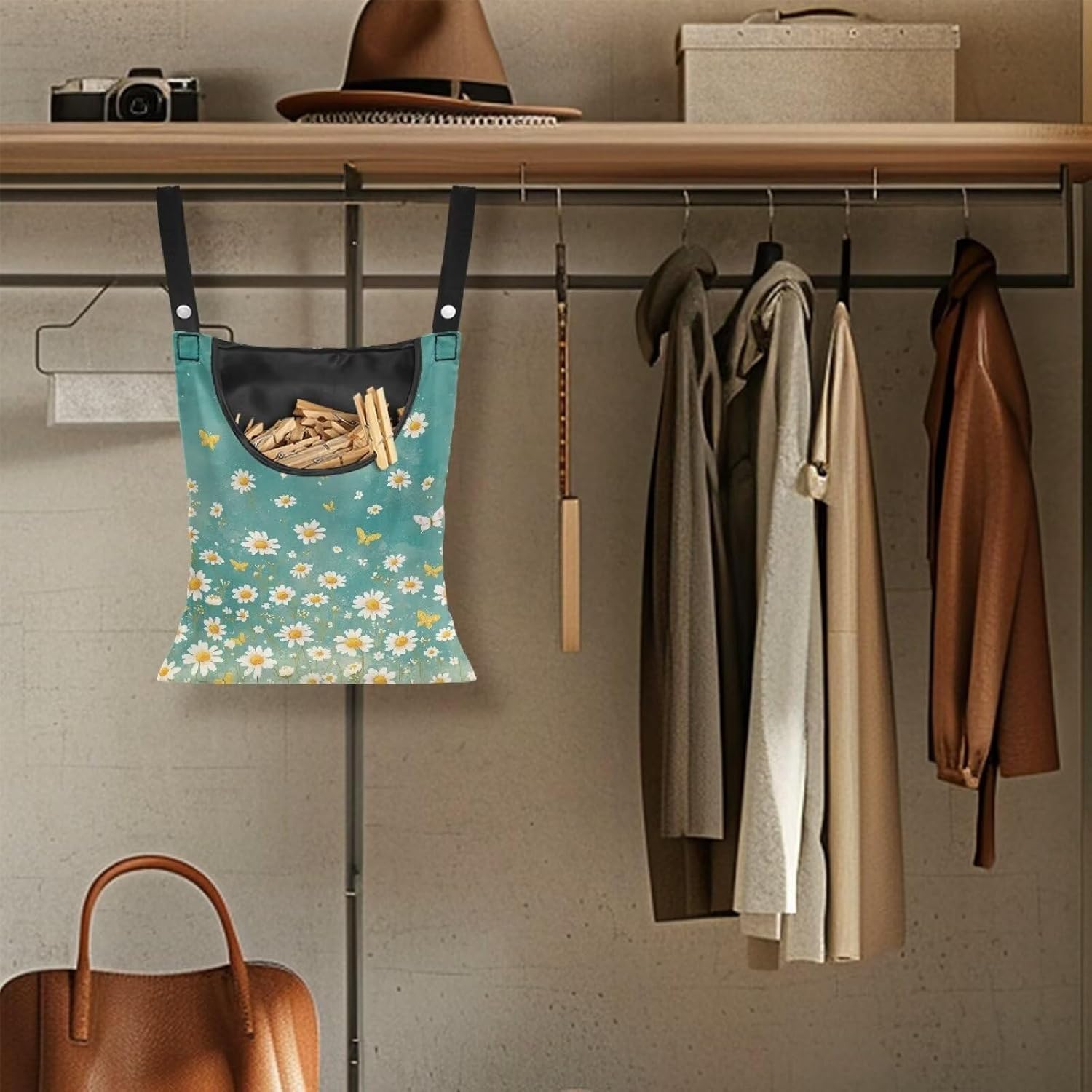 - 【Modern Design】The clothespin bag comes with a waterproof polyester button fastening cord, so you can hang it in different places as needed, such as bedroom, bathroom, balcony, hallway, yard and other indoor and outdoor places, space saving and convenient.