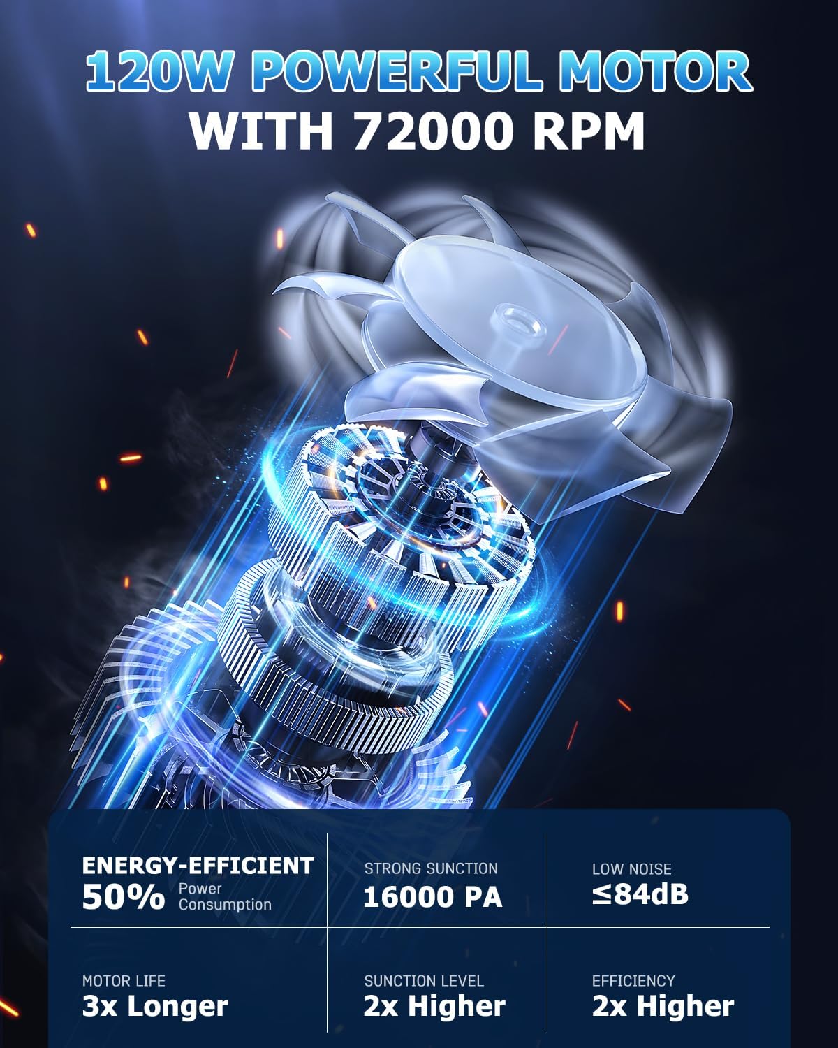 - 🌀【16KPA POWERFUL SUCTION】The dust busters cordless rechargeable is equipped with a 120W high-powered motor that spins at up to 72,000RPM and provides 16,000PA powerful suction. Whether it's dust and debris on the floor or hidden dirt in narrow crevices can be quickly cleaned. Easily cope with the cleaning of home, car interior, office desktop, efficiently clean every corner, saving you precious time and energy