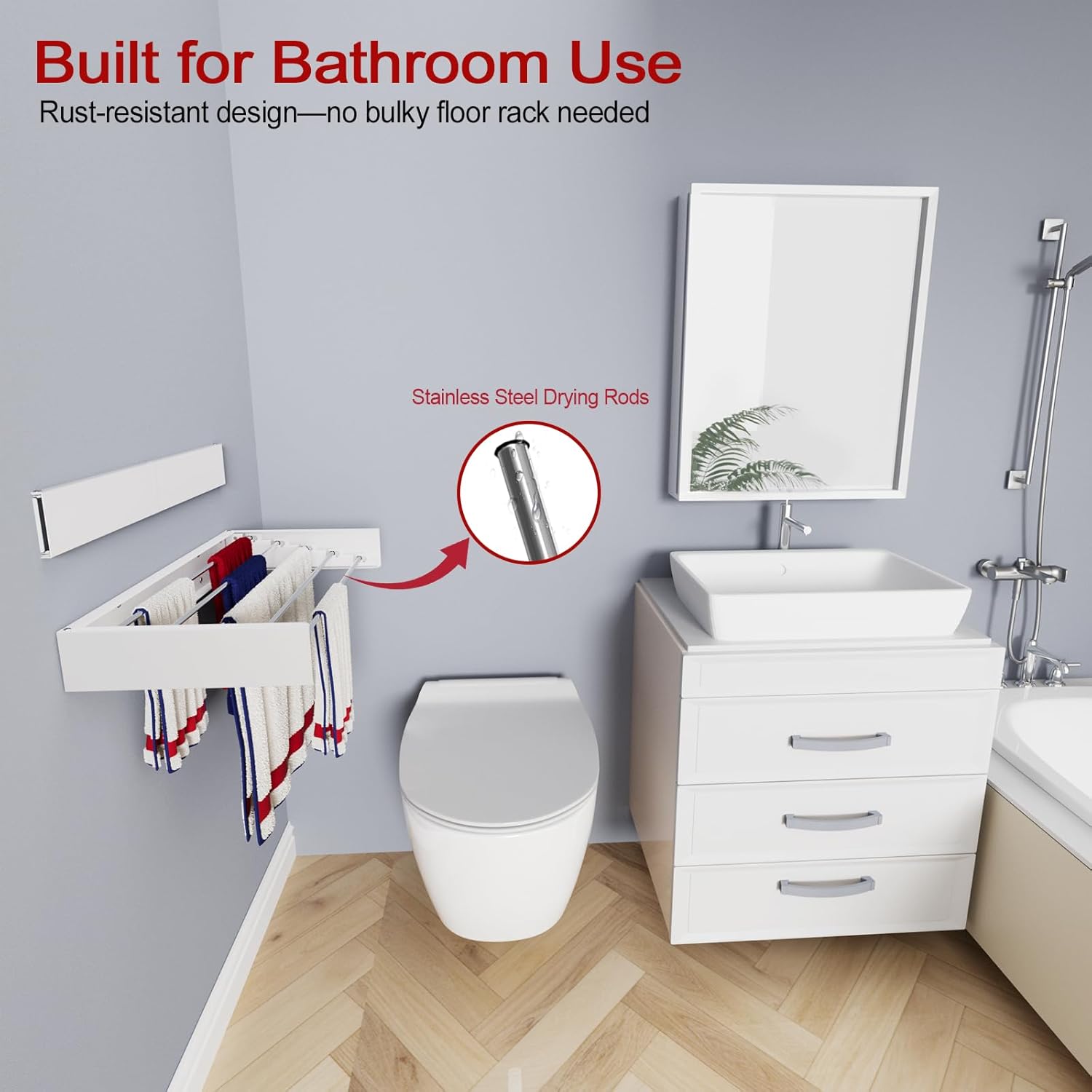 Wall Mounted Drying Rack 31.5", Foldable Laundry Drying Rack with Stainless Steel Rods, Retractable Laundry Space Saver for Indoor & Outdoor Use, Include Wall Template