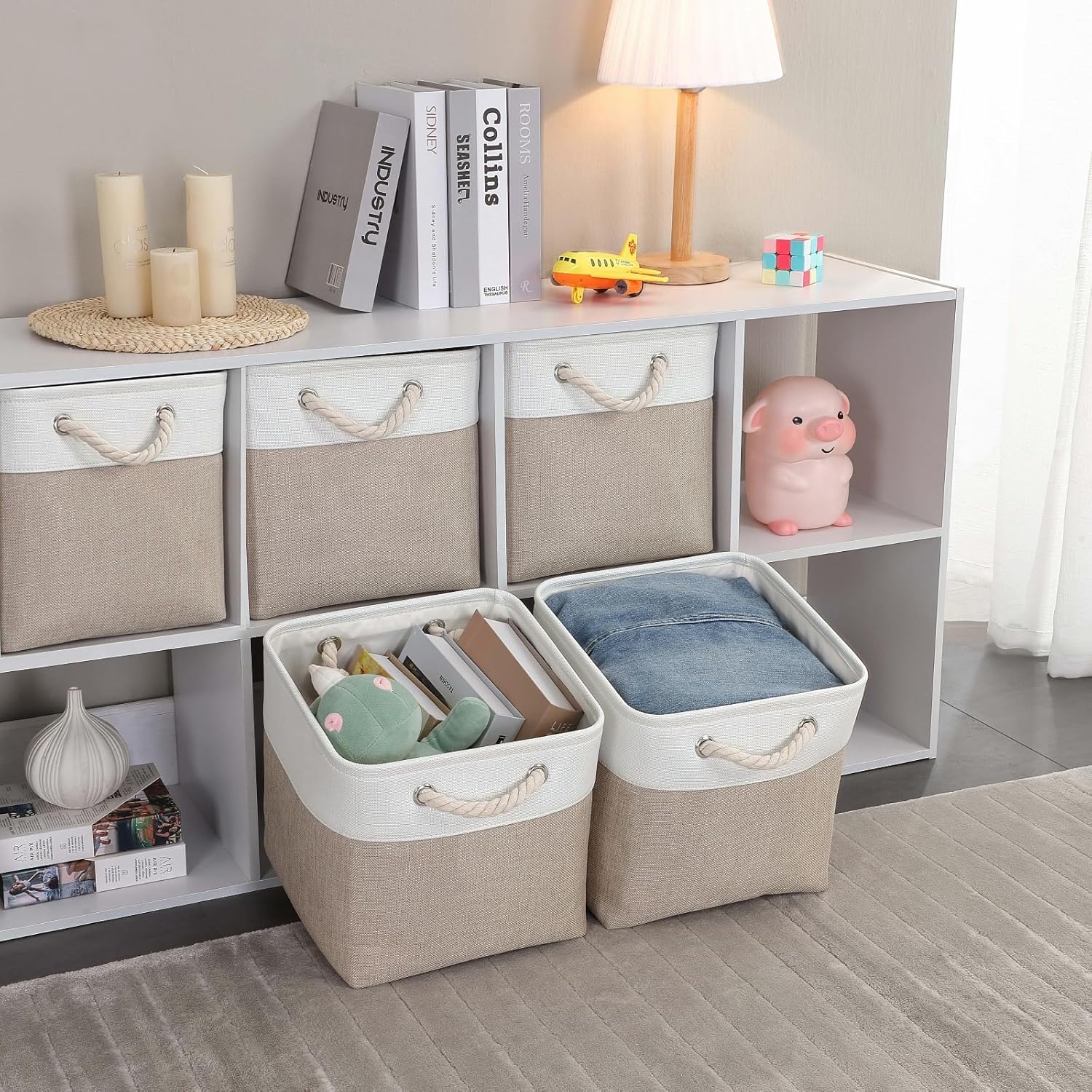 - SIMPLE & FASHIONABLE DESIGN: Our bins are designed with high-grade two-tone design, and the side is equipped with cotton rope handle making it convenient to pull out from the shelf for quick access of your items. Simple design but looks modern and stylish, which can be suitable for most of the rooms in your home or office.