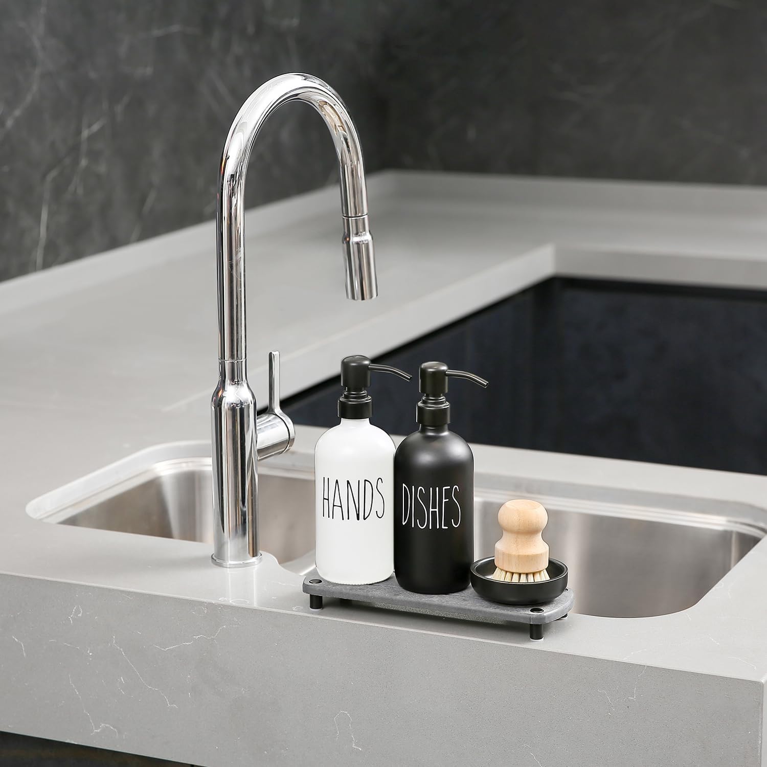 - [Complete Kitchen Cleaning Solution] This set includes one dish soap bottle, one hand soap bottle, a kitchen dish brush, and a ceramic brush holder, all neatly arranged on a stone drying tray.