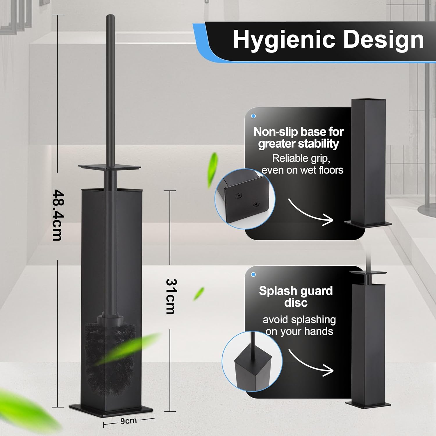 - Mid-Level Splash Guard & Integrated Hygienic Inner Cup – A splash shield at mid-handle height blocks toilet splashback, while the concealed brush holder houses a removable plastic cup that catches drips, prevents leaks, and makes cleanup quick and sanitary.