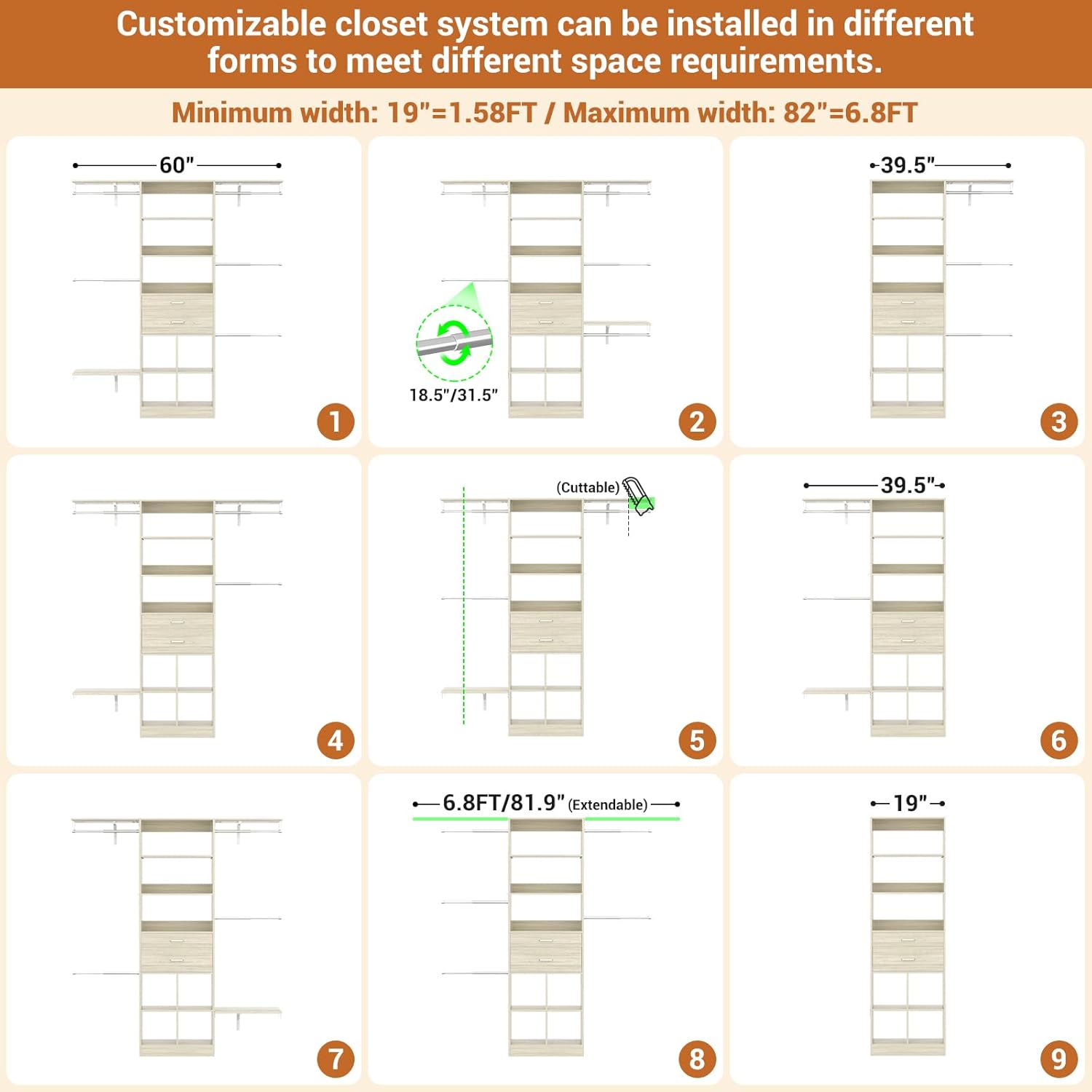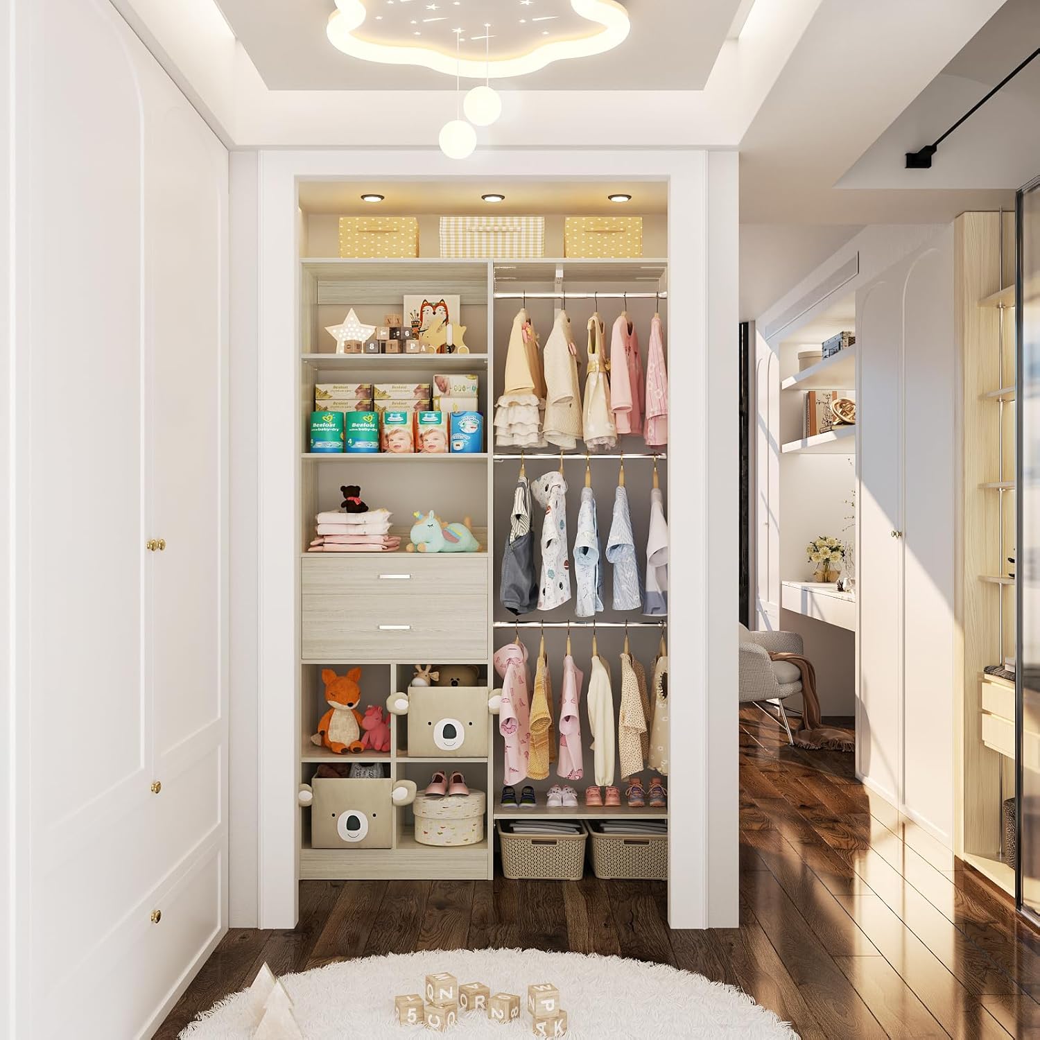 - Customizable Closet System - Besiost closet system with drawers is a valuable addition to your nursery organization and walk-in closets. The small modern closet comes with additional cuttable shelves and adjustable hanging rods, designed to fit well in nurseries of varying sizes