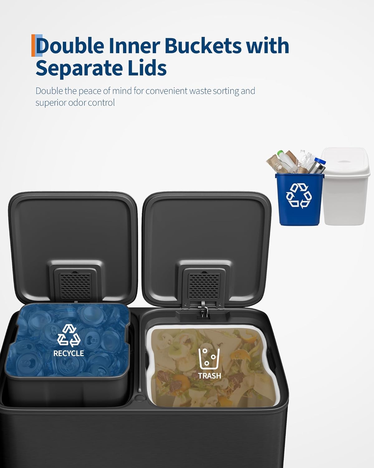 - [PRACTICAL DESIGN] – GarveeHome’s dual trash and recycling bins put ease of use first. Ergonomic side handles let you lift and relocate the entire unit effortlessly. The soft-close lid opens to 80° without collision with standard kitchen island edges, and locks at 95° for hands-free cooking prep and scrap disposal. Dual inner buckets with weighted-edge lids trap odors separately. A custom liner ring secures any standard bag snugly, eliminating slips, bunching, and overhang
