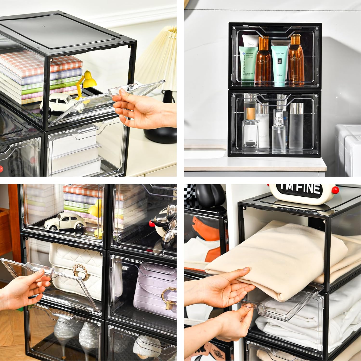 - Thoughtful Design: Clear magnetic front door, Stackable design,Shoe storage boxes allow you put sneakers in the box, fits various types of shoes. Sneakers, heels, flats, flip flops, sandals, wedges. Find right shoes through clear front door with a glimpse.