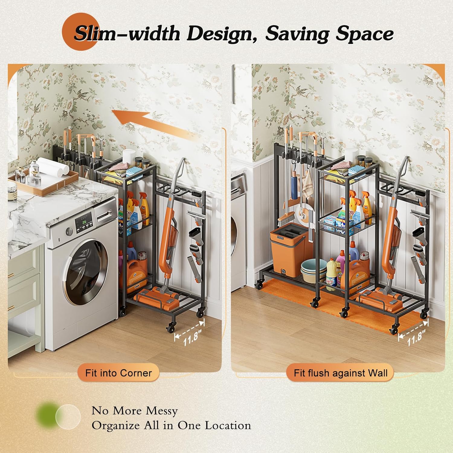 - 【Large-capacity Broom Closet】Equipped with 6 broom grippers and 2 double-side hooks for brooms, mops and dusters, the broom rack keeps your most-used tools upright and easy to grab. 3-tier spacious cleaning caddy offers plenty of room for storing sprays, cloths, and other cleaning products, while a dedicated vacuum stand with 5 accessory holder fits most vacuum cleaners. Everything stays organized in one compact, space-saving unit.
