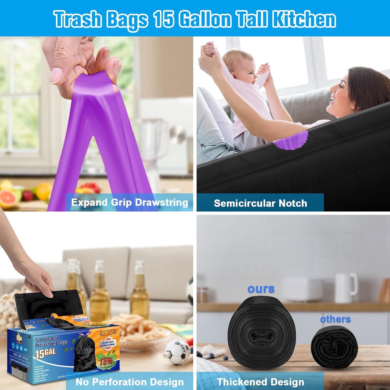 - [Packaging&Satisfaction Guarantee]: Includes 30 bags tall kitchen garbage bags(30 counts of a roll) . Bag dimensions equal 2ft wide by 2.5ft tall, bag thickness equals 0.85 mil. Translucent trash bag with purple drawstring closure for easy tying and carrying, Also you can separate recyclable from non-recyclable materials. Satisfaction Guarantee: We’re proud of our products, If you aren’t satisfied, we’ll refund you for any reason within a year of purchase.