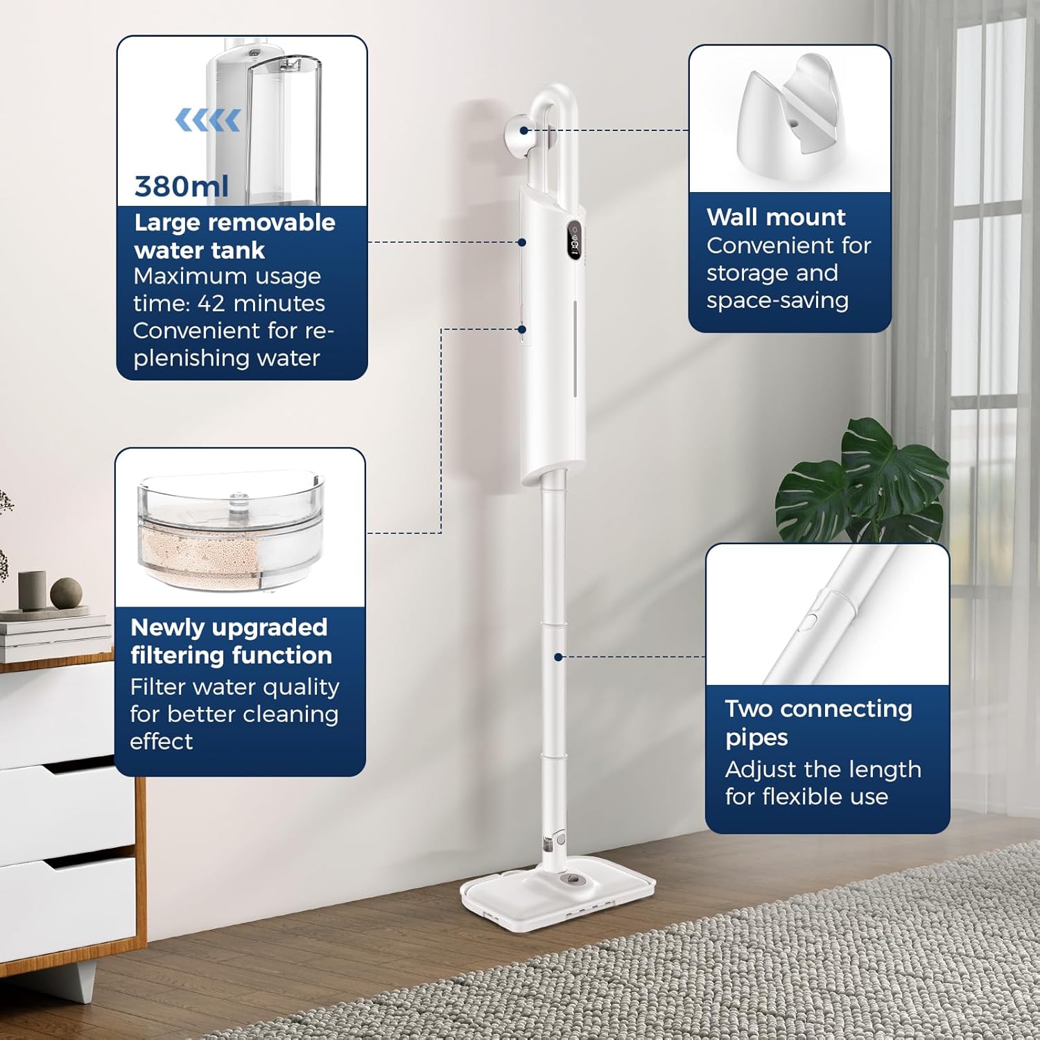 - New aromatherapy function. You can add aromatherapy and essential oils to the head of the mop to bring a fresher atmosphere to your home environment after cleaning. The mop head can be adjusted up and down by 90° and left and right by 180°, and it comes with a 16.4-inch power cord, allowing you to clean the bottom and corners of furniture. It comes with a wall-mounted device and is easy to store.