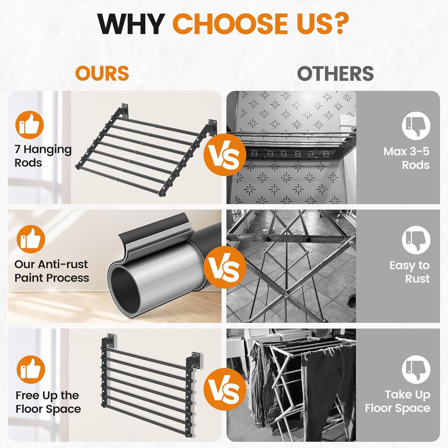 - Heavy-Duty & Stable Construction - Built with two thick 3mm alloy steel brackets and seven horizontal rods, this drying rack clothing wall mounted supports up to 100 lbs. Strong enough for heavy loads of laundry, towels, or bedding.