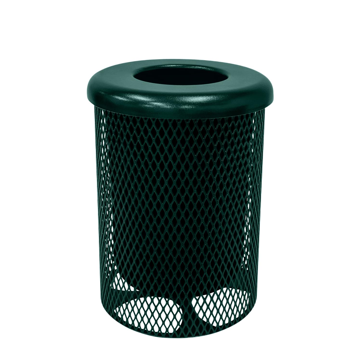 Coated Outdoor Furniture 32-Gallon Heavy-Duty Expanded Metal Round Trash Receptacle, Commercial Outdoor Waste Bin with Liner & Black Flat Top Lid – Made in America (Textured Dark Green)