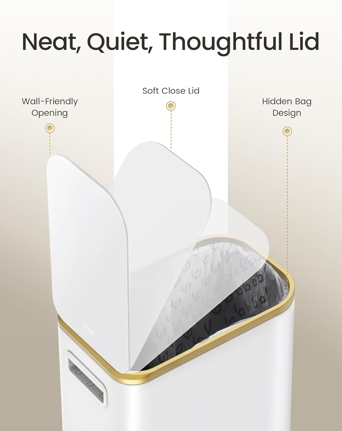 - Modern Minimalist Style: A monochrome white body paired with gold-trimmed lid edges and pedal creates elegant minimalist aesthetics. The matte finish balances metallic accents, seamlessly blending into modern, nordic or light luxury interiors to elevate your space.