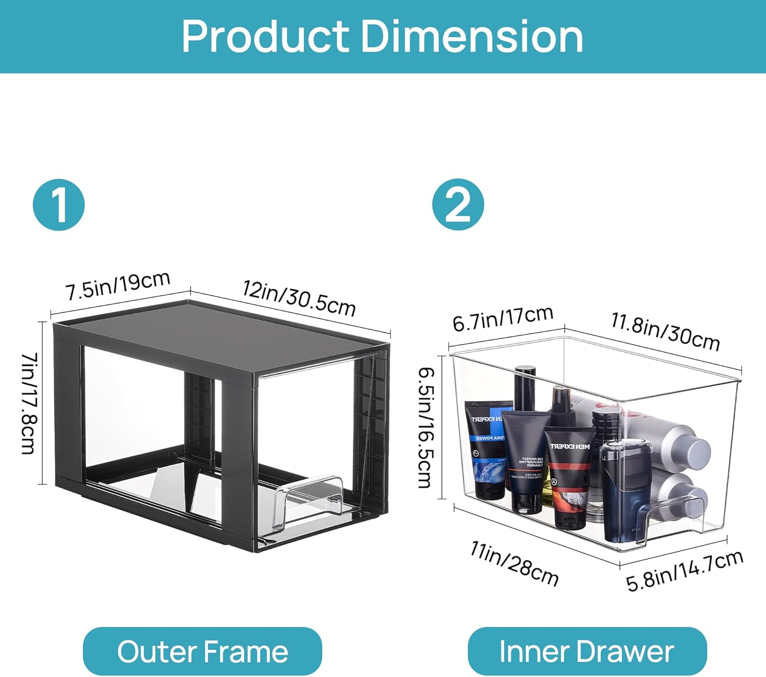 - High Quality Acrylic Organizer--These storage bins are made by PET material, which is 12"L x7.5"W x 7"H, and the using size is 11"L x 5.8"W x 6.5"H. It can bear 15lbs when stacked