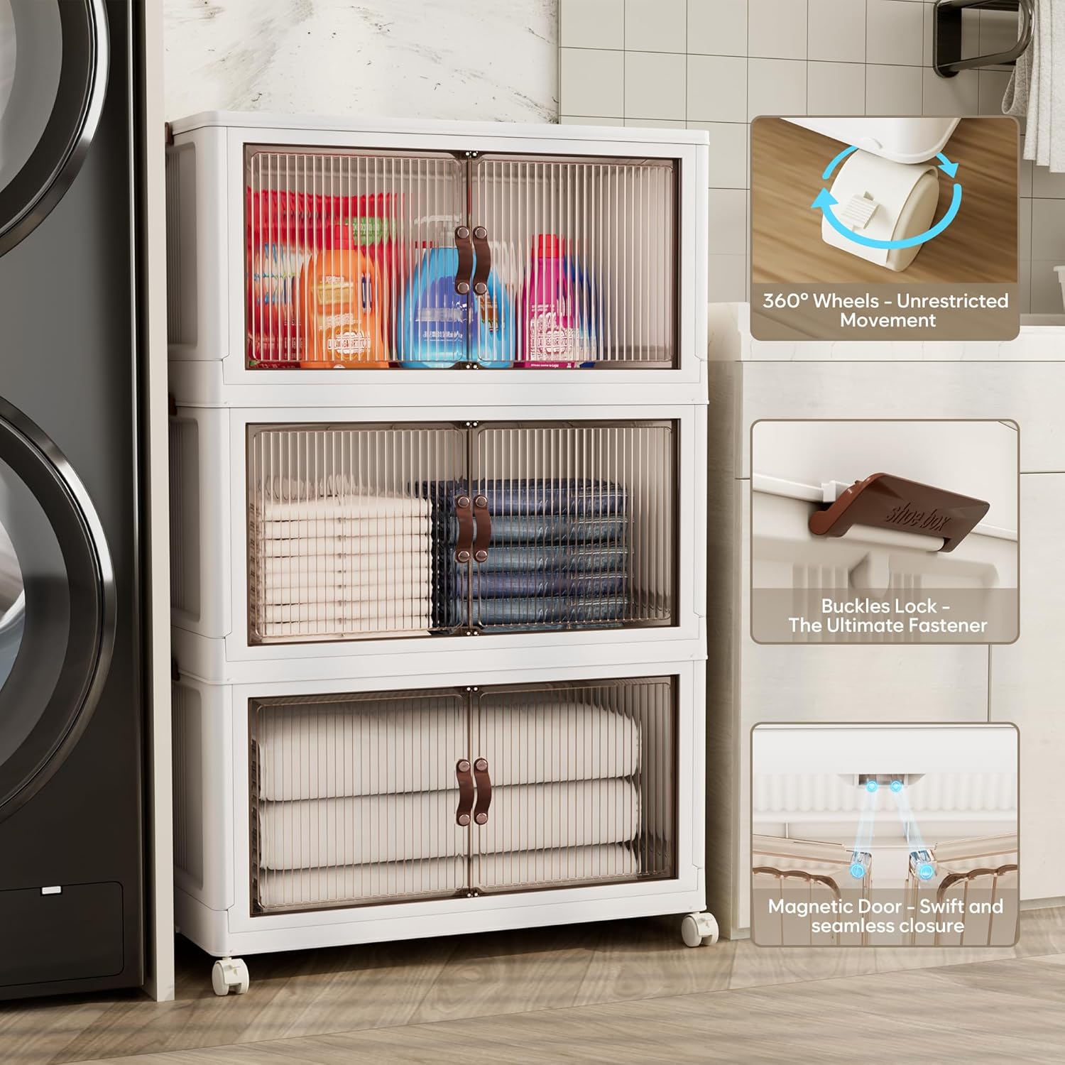 - 【Stackable & Magnetic Door & Rotating Wheels】The storage box has a groove design for stacking stackable storage bins. With side and rear buckles, the stacked boxes stay steady and secure. Equipped with four 360° rotating wheels, it’s easy to move and perfect for closet organizers and storage, keeping your space organized.
