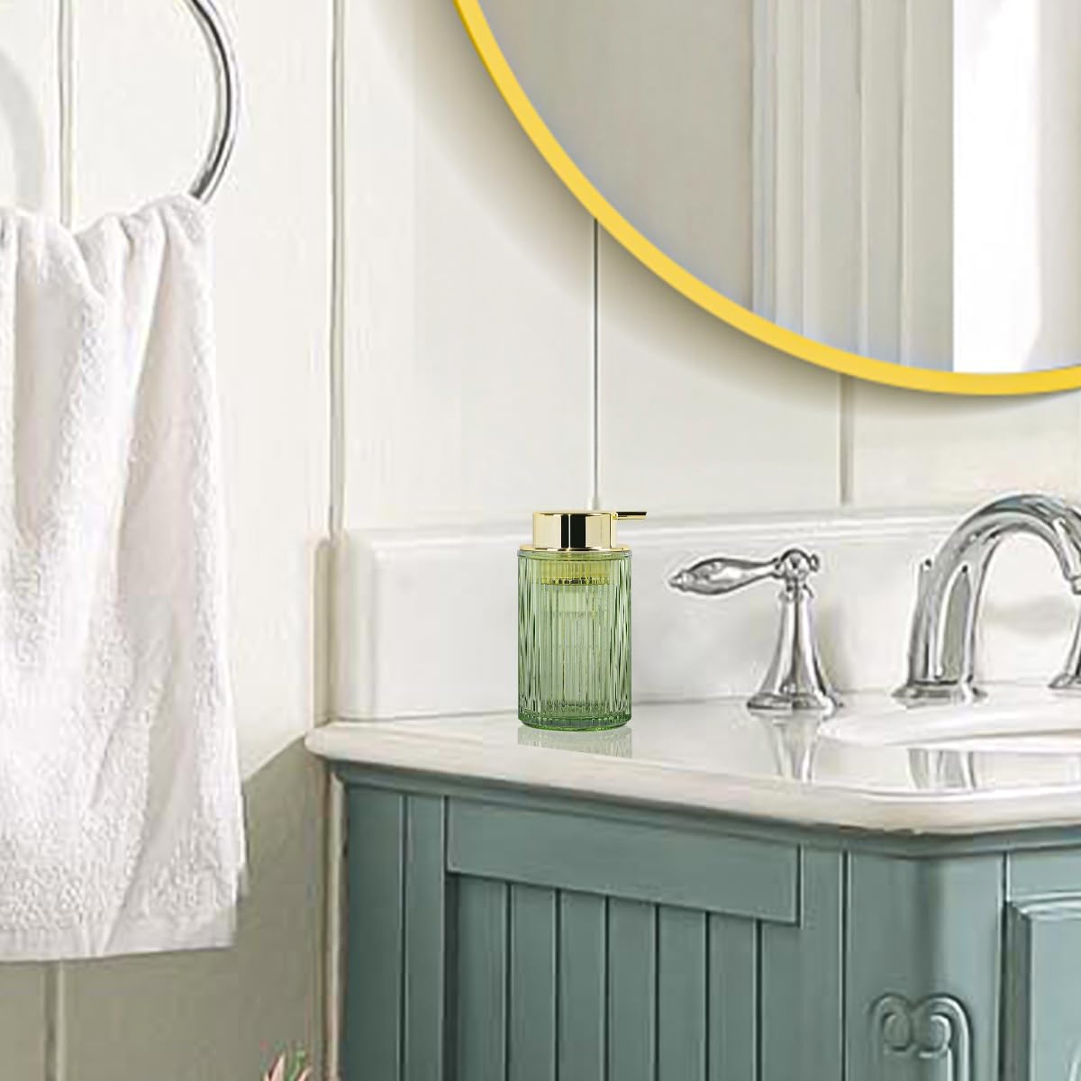 Green Foaming Soap Dispenser, 12 Oz Glass Foaming Hand Soap Dispenser with Gold Pump, Bathroom Refillable Liquid Lotion Container Pump Ribbed Bottle for Kitchen Bathroom Decor, 2pc