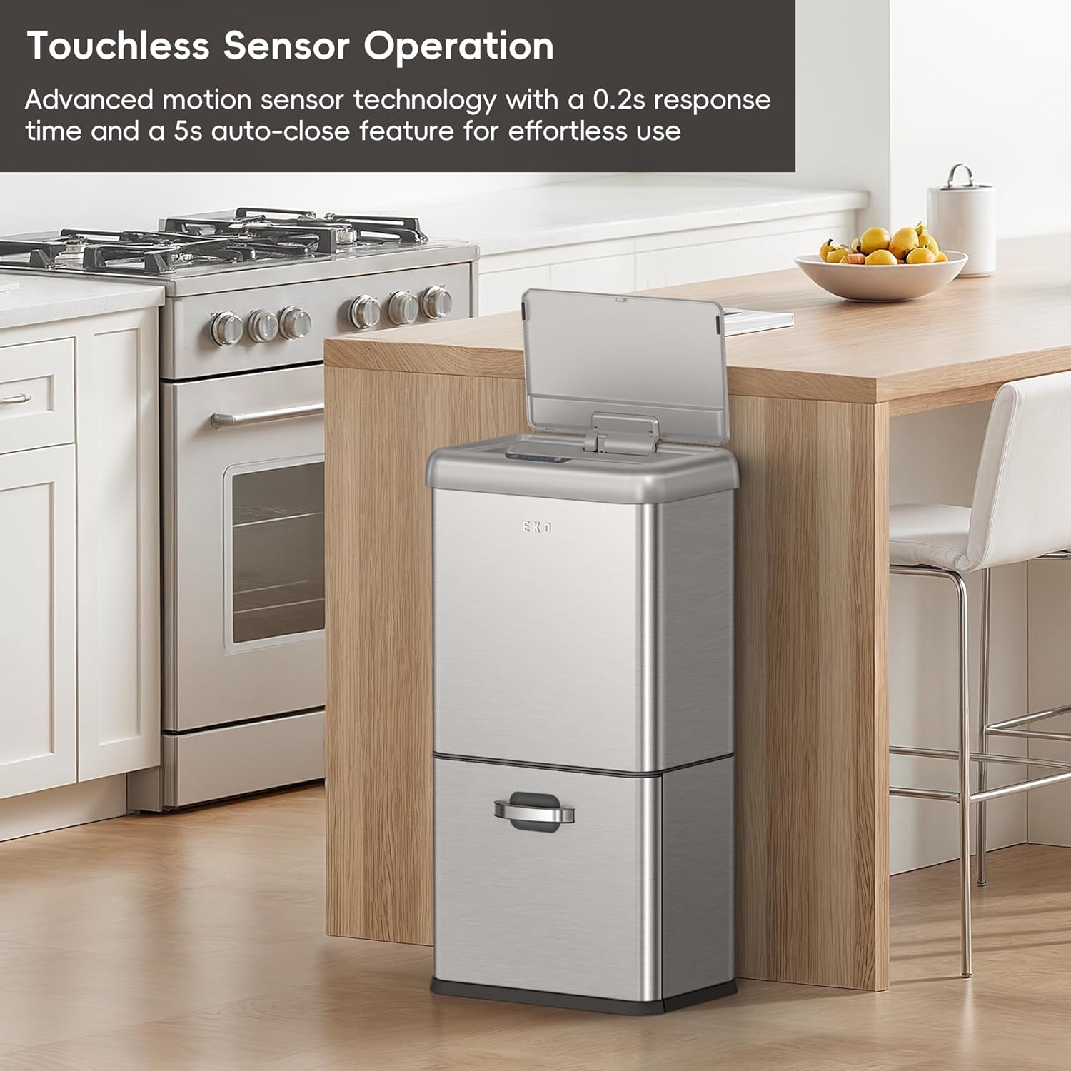 EKO Vintage 50L / 13.2 Gallon Motion Sensor Trash Can, Dual Compartment 32L + 18L Stainless Steel Kitchen Garbage Bin, Touchless Automatic Waste & Recycling Bin with Lid for Home or Office