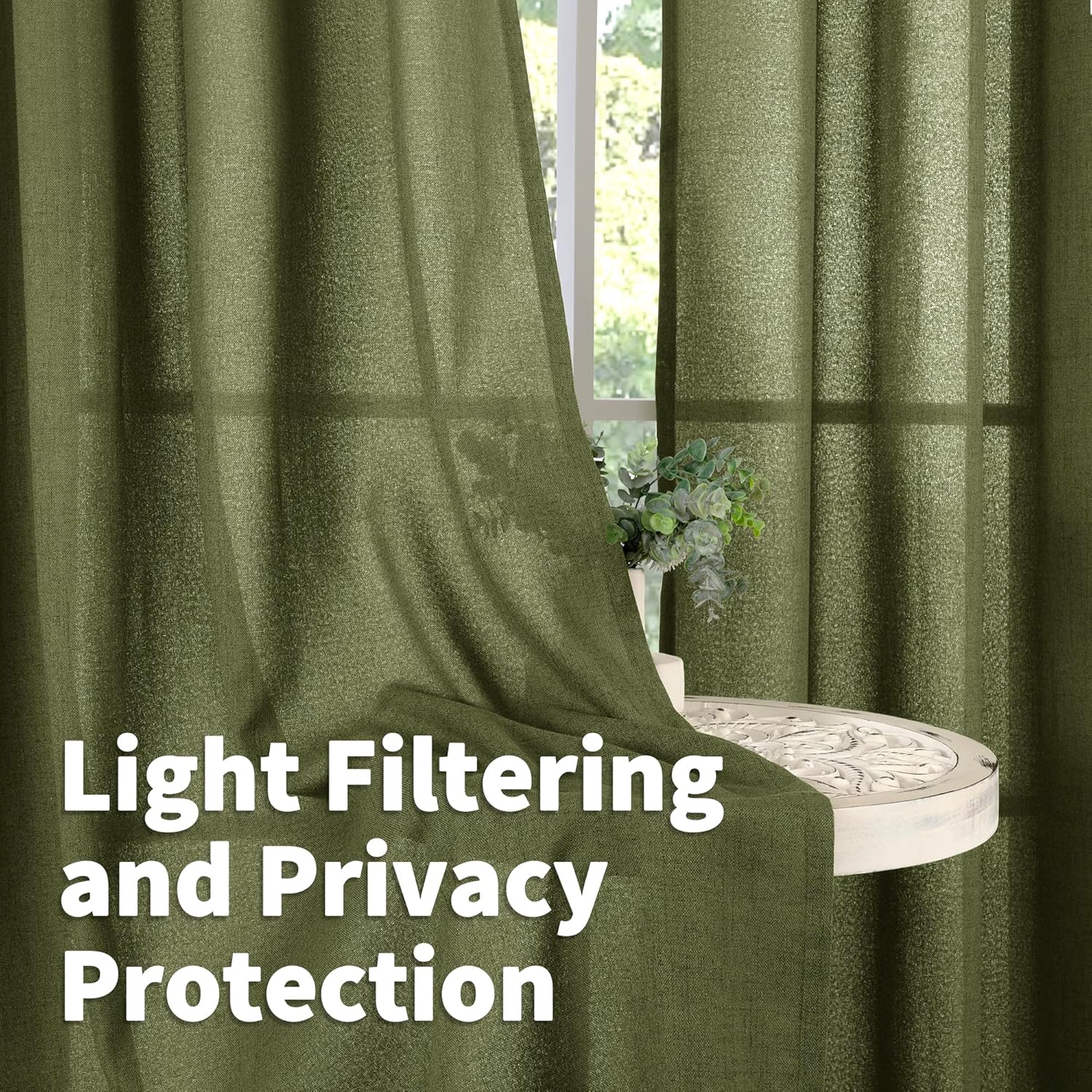 YoungsTex Olive Green Linen Curtains 80 Inch Length for Living Room, Semi Sheer Window Drapes with Rod Pocket Back Tab Light Filtering Decorative for Office Bedroom, 2 Panels, 52 X 80 Inch