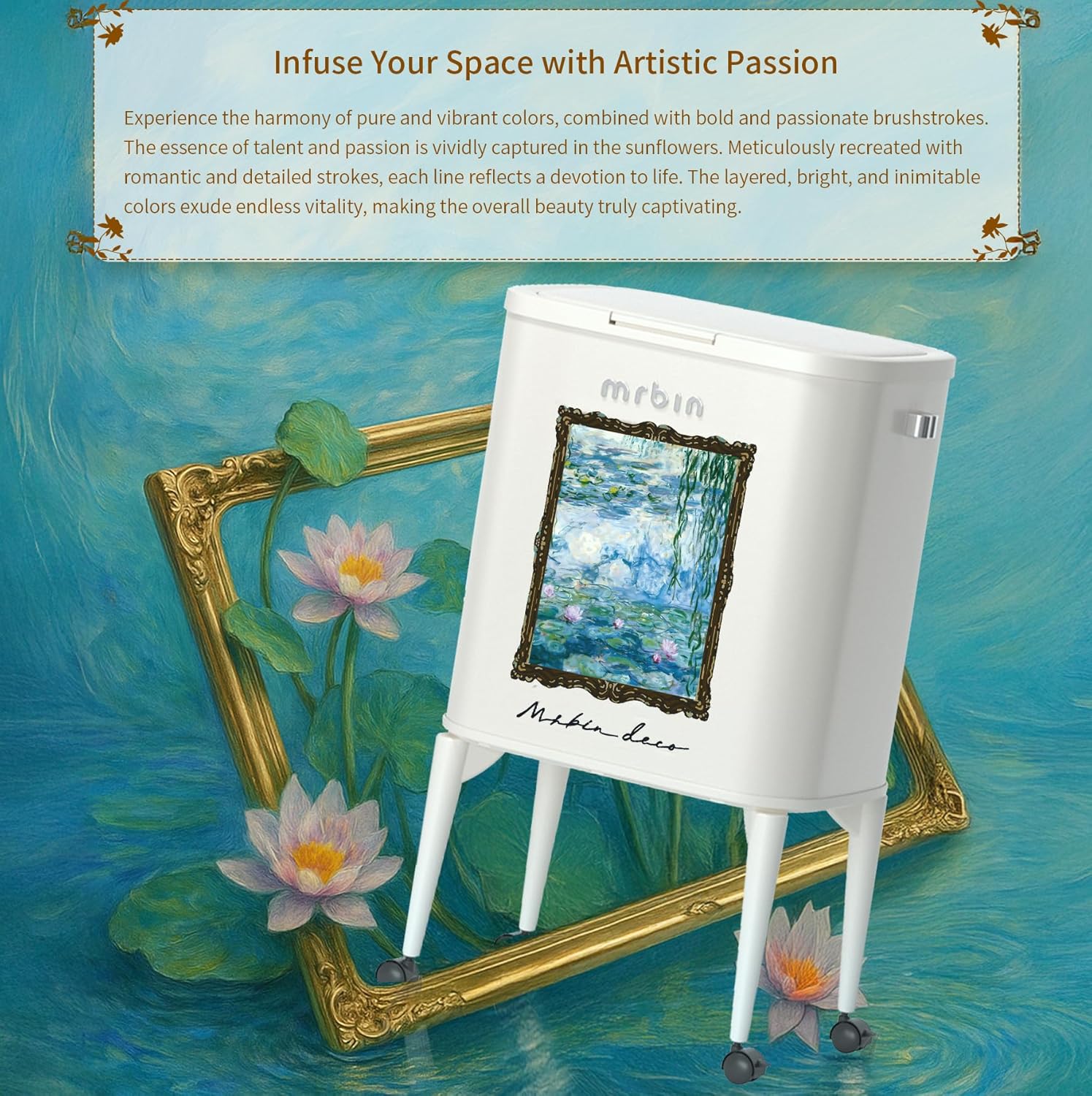 - Artistic Aesthetic in Decor: This decorative trash can features a classic water lily pattern, embodying a sophisticated touch with art-framed paint ornaments. It reflects a taste for art and attitude in home decoration, blending seamlessly into any room's aesthetic.