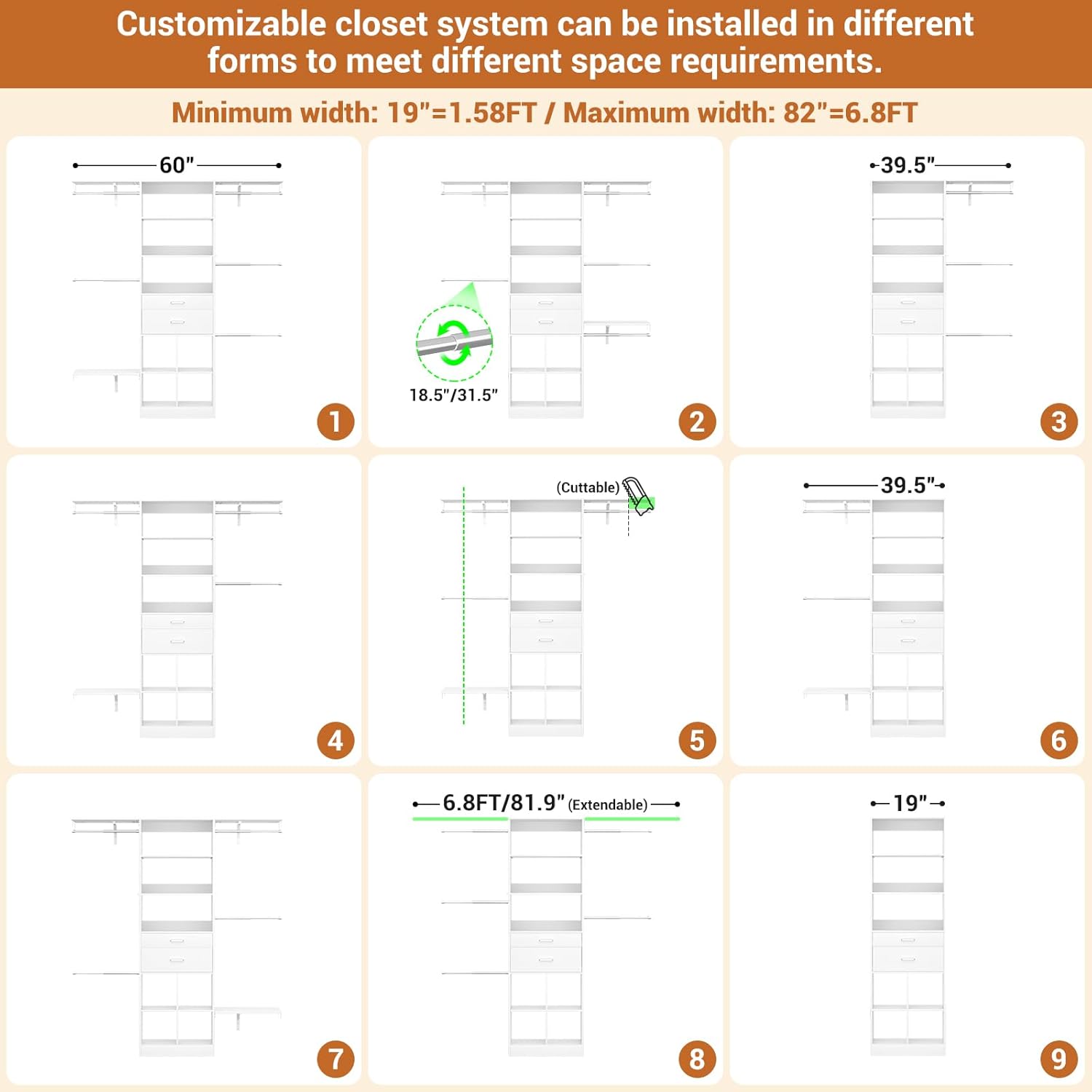 - Customizable Closet System - Besiost closet system with drawers is a valuable addition to your nursery organization and walk-in closets. The small modern closet comes with additional cuttable shelves and adjustable hanging rods, designed to fit well in nurseries of varying sizes.