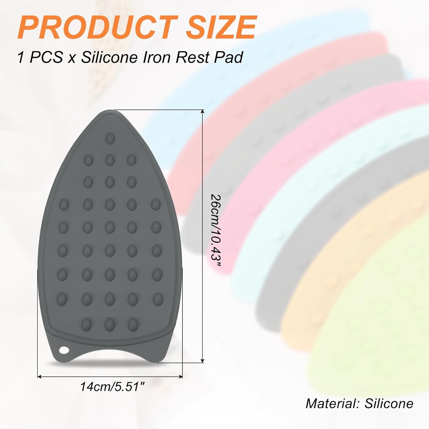 - Specification: Color: Gray; Material: Silicone; Size: 26.5 x 14cm/10.43x5.51inch (L*W); Thickness: 3mm/0.12inch; Packing List: 1 x Silicone Iron Rest Pad