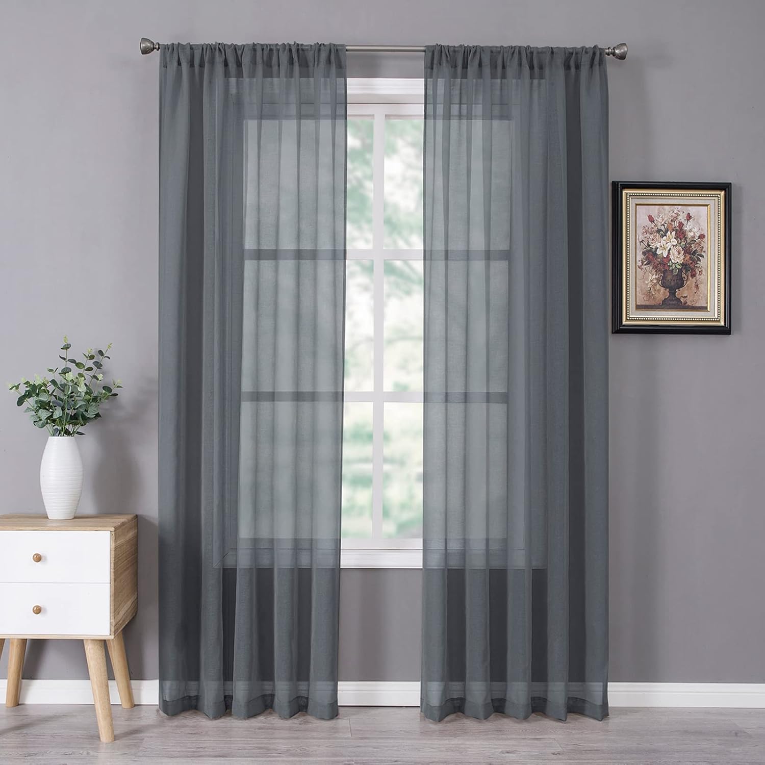 Tollpiz Sheer Curtains Bedroom Linen Textured Curtain Sheers Light Filtering Voile Rod Pocket Curtains for Living Room, 38 x 84 inches Long, Dark Grey, Set of 2 Panels