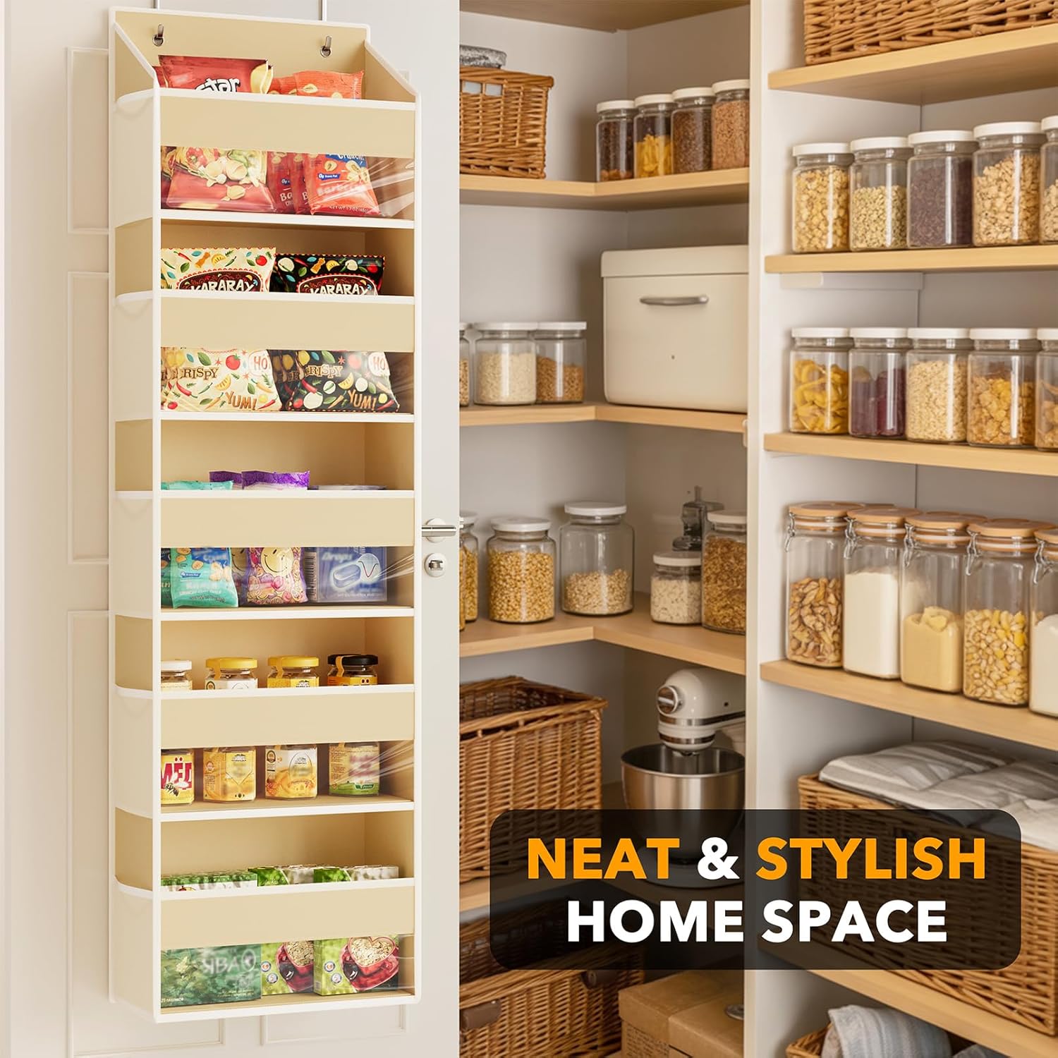 - ORGANIZED AND BEAUTIFUL - Make your behind the door space neat and organized with this beige over the door storage and organizer with 5 clear pockets and 10 mesh side pockets; Product Size: 15.2"W x 6.6"D x 55"H