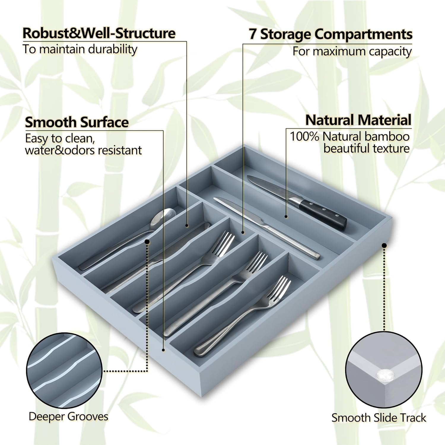 Silverware Organizer, 12.5 Inch Utensil Organizer Kitchen Drawer Organizer Bamboo Silverware Holder Cutlery Tray Organizer in Drawer Flatware Organizer Tray(7 slots, Gray)