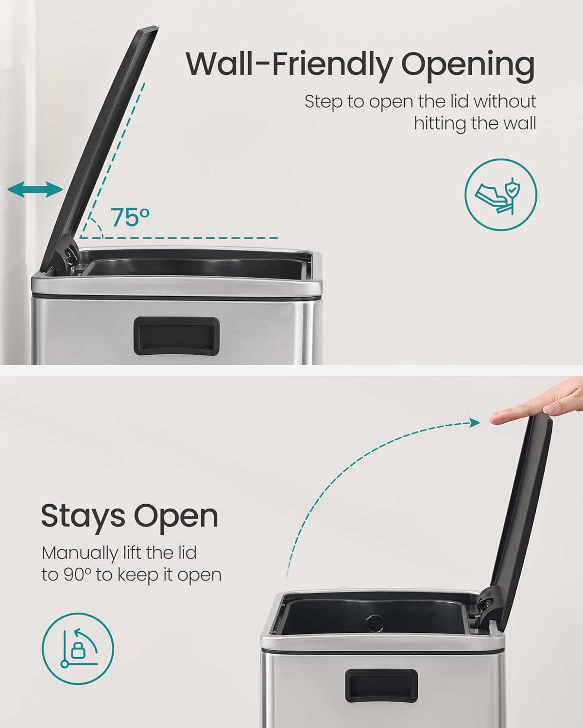 - Easy to Empty: The inner bucket, equipped with 2 side handles, simplifies emptying and cleaning, making the daily upkeep of your garbage can more convenient