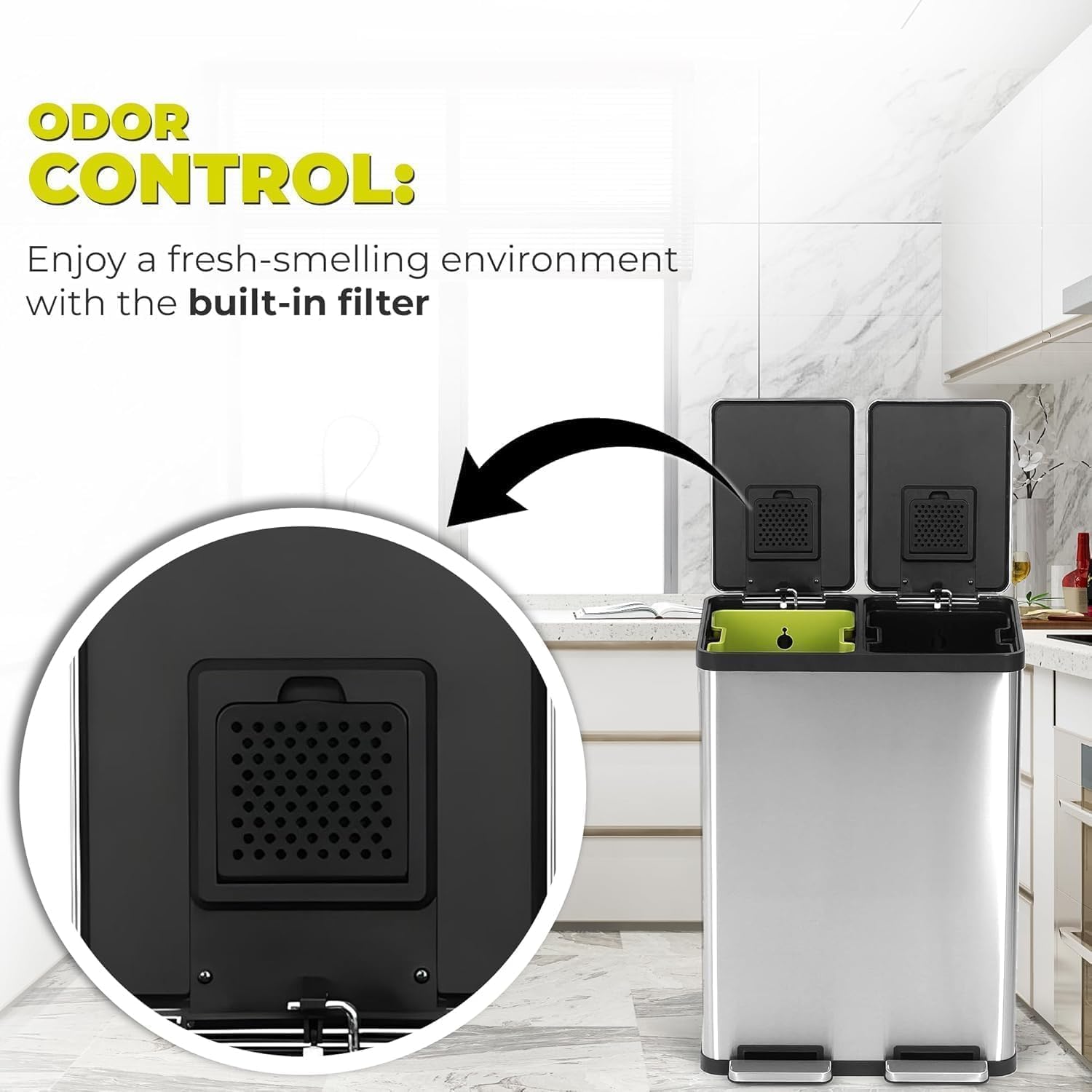 - HANDS-FREE USE: The stainless-steel foot pedal stands up to daily use and removes the need to touch the lid during waste or recycling disposal to keep hands clean.