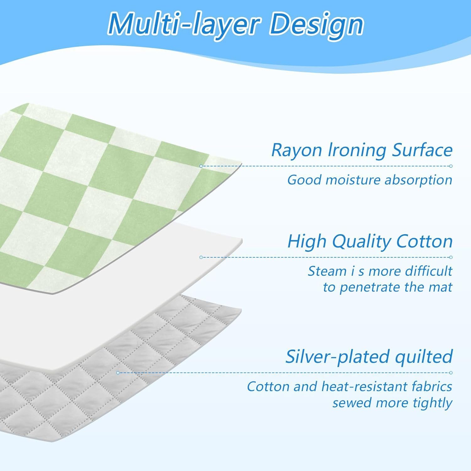- High Quality:This ironing mat adopts a multi-layer design, with a surface made of Rayon lroning and good moisture absorption. High quality cotton in the middle makes it Steam more difficultto penetrate the mat. The bottom layer is coated with 210 silver-plated quilted, with cotton and heat-resistant fabricssewed more tightly. The ironing pad can be used on both sides, making it more durable