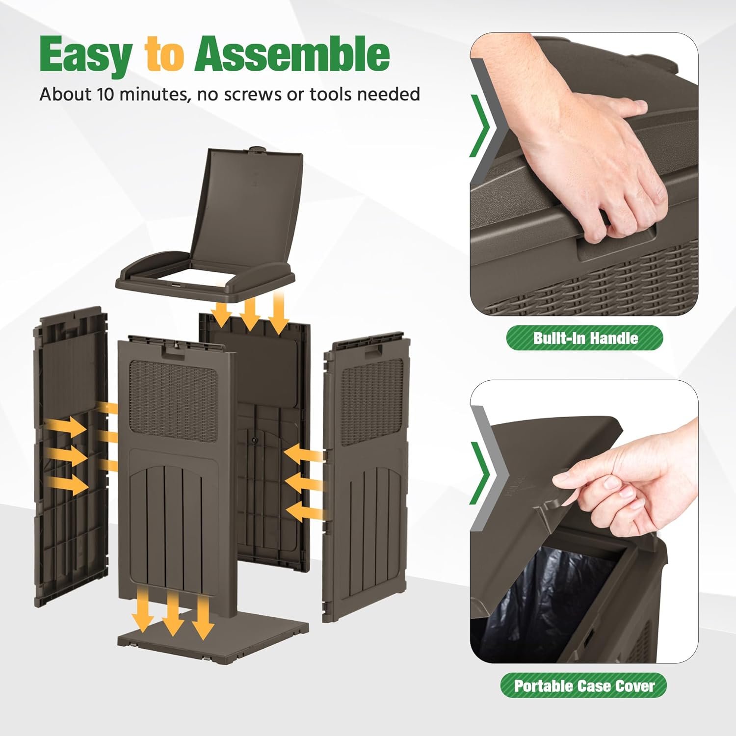 - Easy to Install Trash Bags: The waste bin for outdoors is compatible with 30-33 gallon trash bags. You need to lift the trash bag holder, put on the trash bag, put down the holder, and then finish the installation. After opening the inner lid, the garbage bag can be stably fixed in the card slot