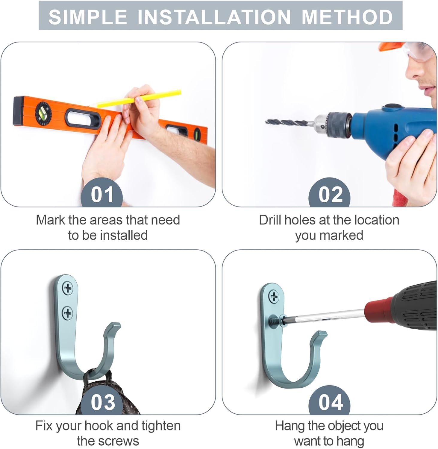 - Quality Upgrade: For the problem of deformation of wall hooks, we have upgraded the material, increased the iron content, so that the quality and hardness of wall hooks and screws are greatly enhanced, it has the function of anti-corrosion and anti-rust, making them strong and durable