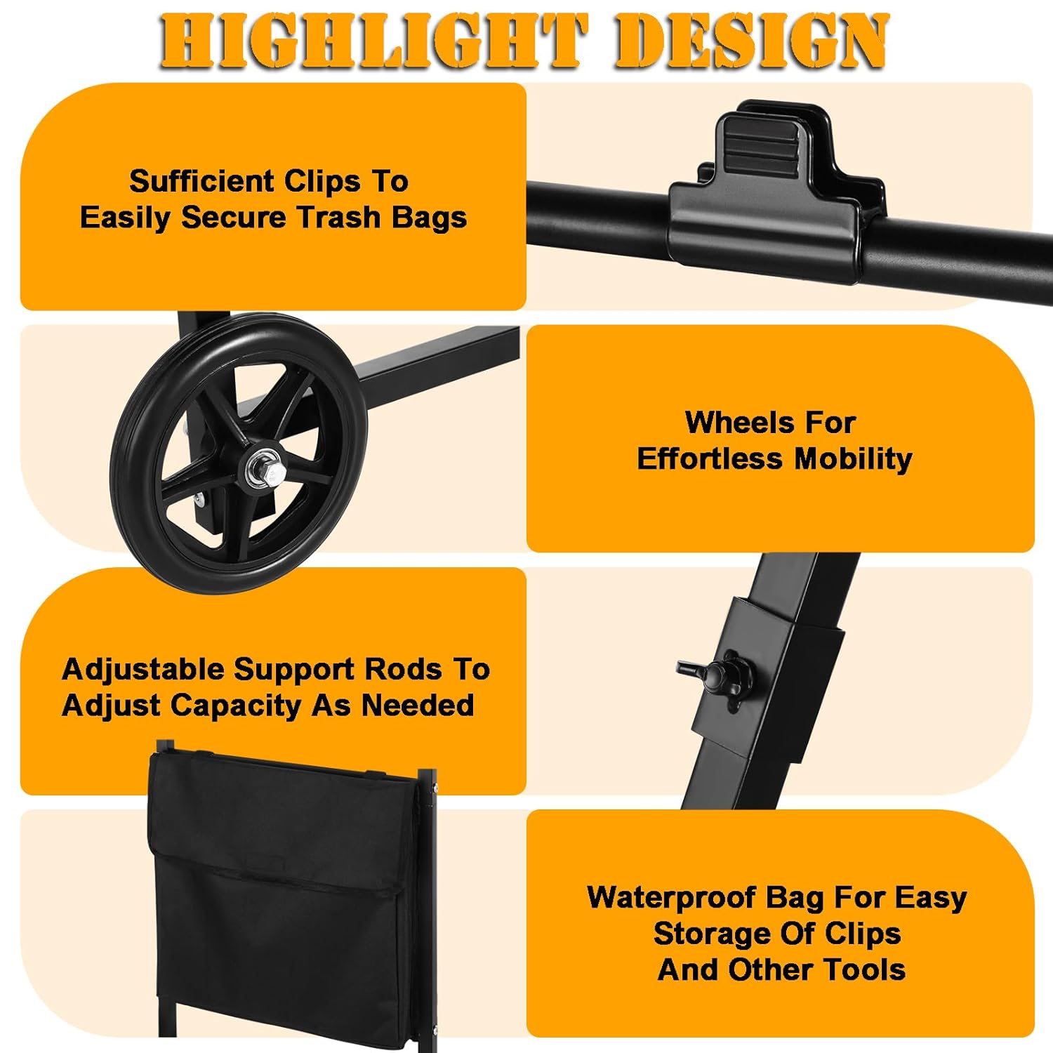 - Adjustable Capacity Design: This leaf bag holder boasts an extra large storage capacity of 30-45 gallons (Bag Not Included) and is equipped with 10 clips to keep the trash bag open for collecting yard waste and leaves grass clippings. The leaf bag holder is also equipped with a waterproof cloth bag for convenient storage of clips and other outdoor tools. You can adjust the height of the support rod to adjust the capacity you need, which can fit different capacity of plastic bags and paper bags.