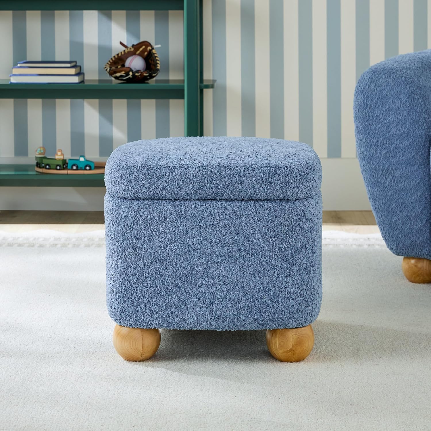 Walker Edison Linley Contemporary Small Storage Bouclé Ottoman with Wood Legs, Soft Blue