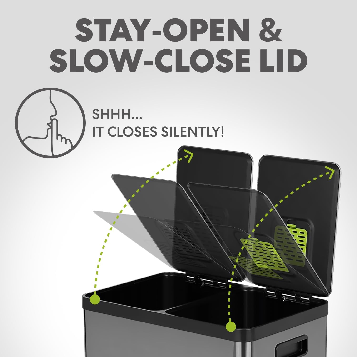 SIMPLI-MAGIC 16 Gallon (60L) Elegant Black Step Trash Can – Dual Compartment Kitchen Garbage Can with Waste & Recycling Bins – Slow-Close Lid, Odor Control, Hands-Free, Premium Stainless Steel