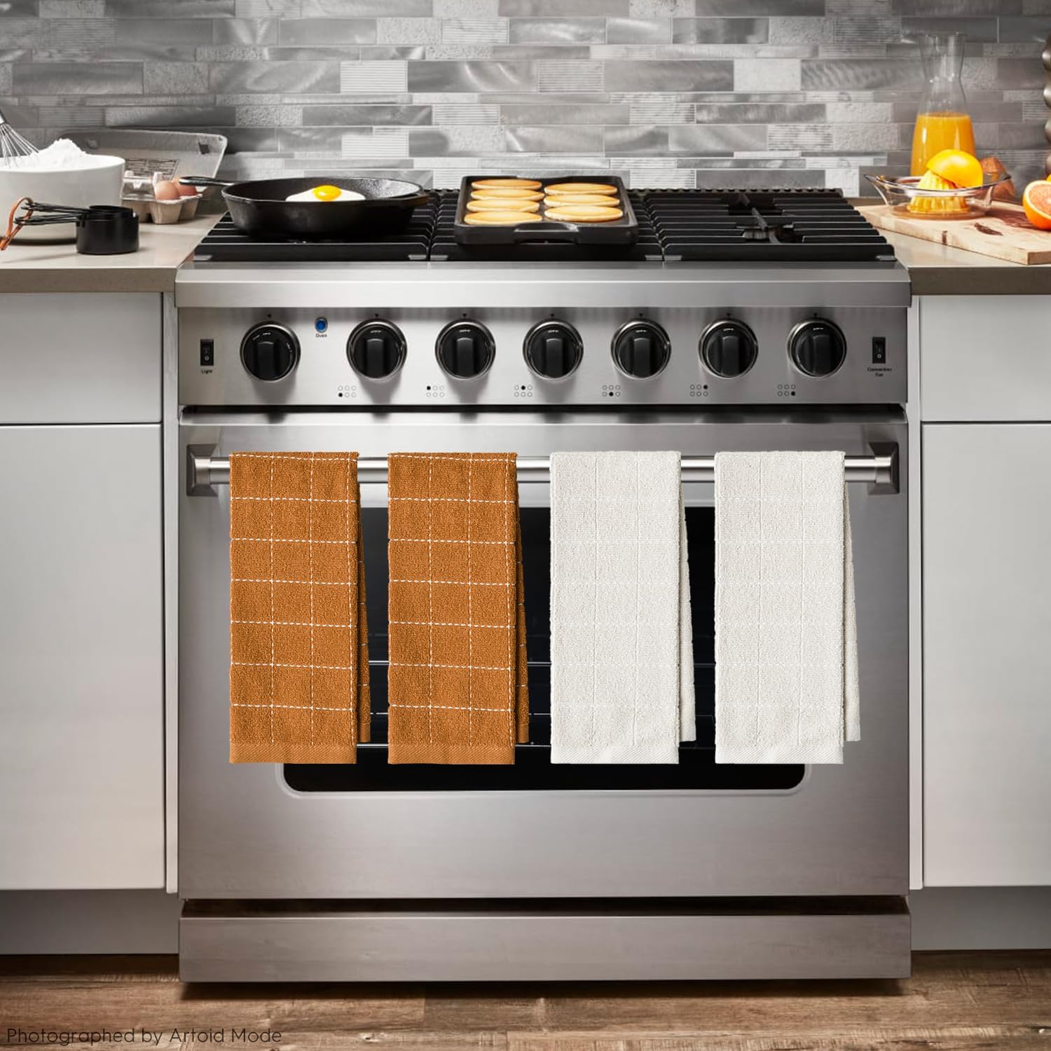 Artoid Mode Checkered Designed Cotton Beige Caramel Terry Kitchen Dish Towels, 15x25 Inch Soft Absorbent Quick Drying Cleaning Tea Towels Set of 4
