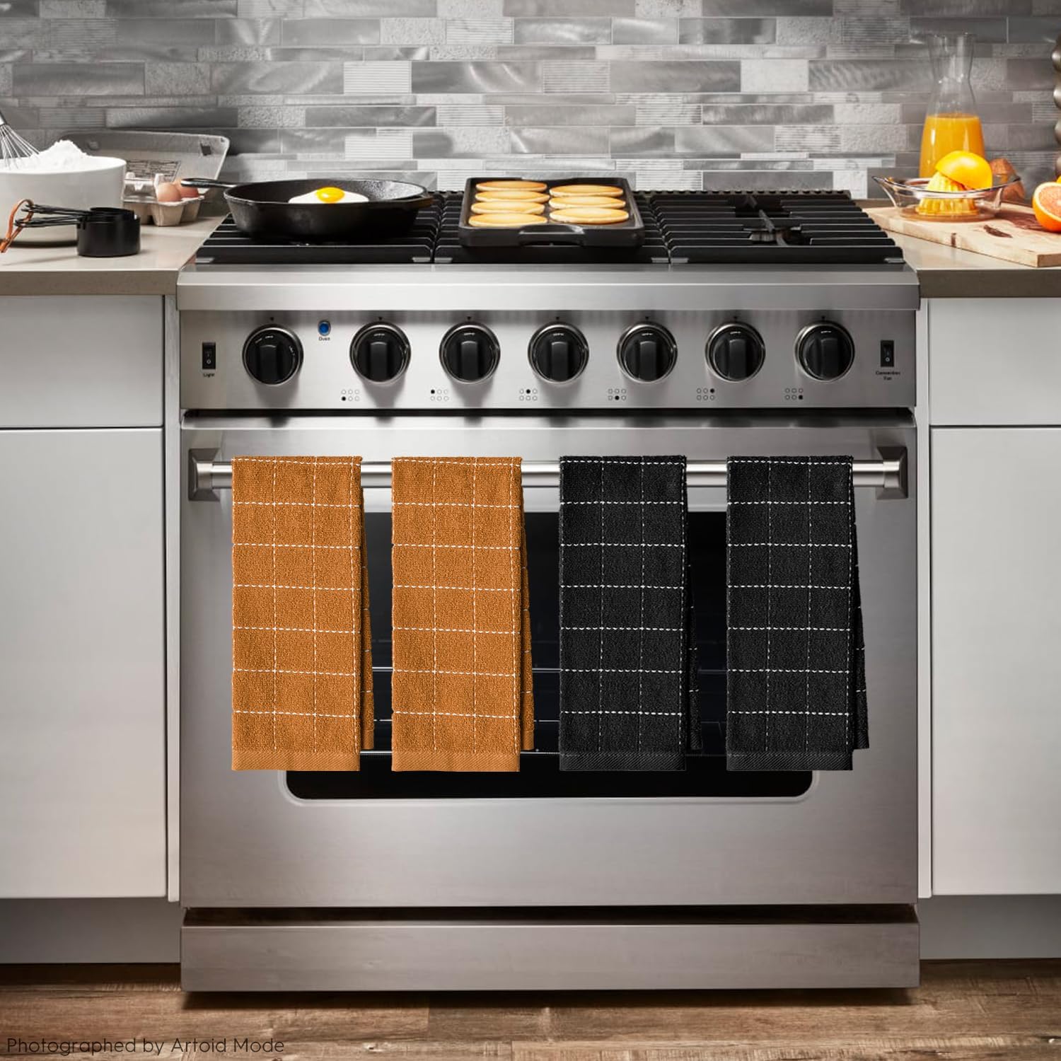 Artoid Mode Checkered Designed Cotton Black Caramel Terry Kitchen Dish Towels, 15x25 Inch Soft Absorbent Quick Drying Cleaning Tea Towels Set of 4