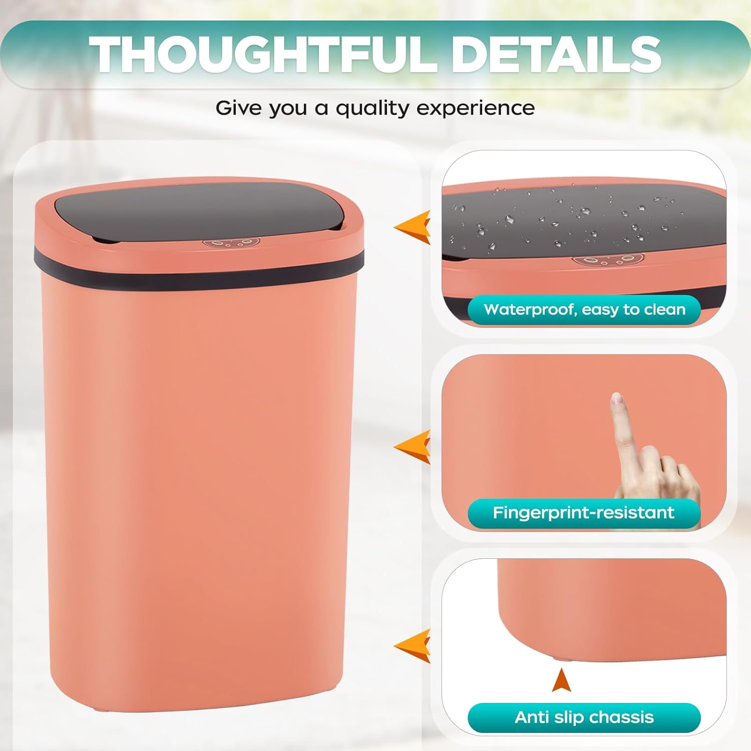 - Silent Operation: Designed with noise reduction in mind, our touchless trash bin operates quietly, offering a seamless experience in any setting, including bathrooms. The gentle opening and closing mechanism ensures a peaceful environment for you and your family.