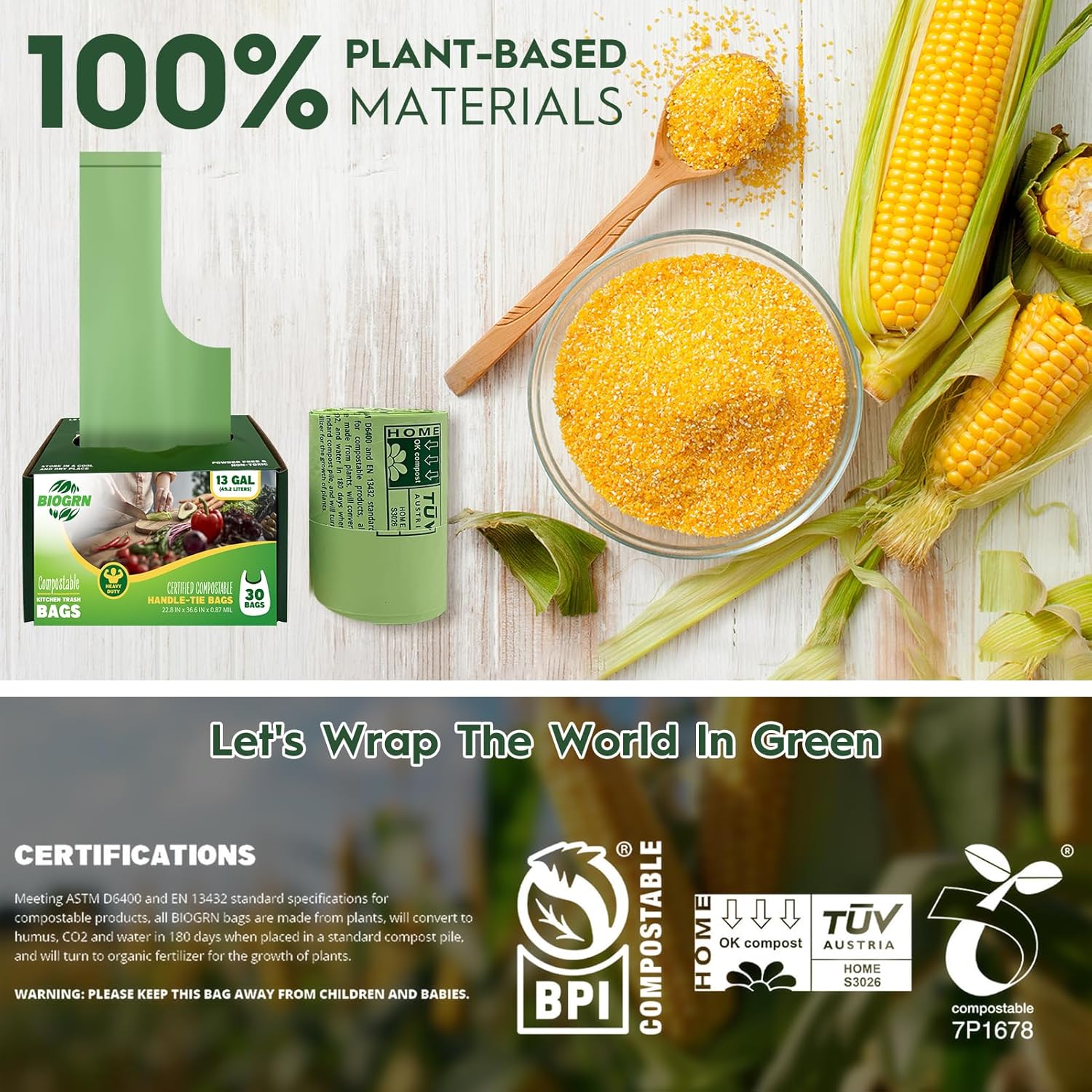 - Perfect 13 Gallon Kitchen Fit:These 13 gallon tall kitchen trash bags (22.8"x36.6") fit standard bins perfectly. Each roll contains 30 durable handle-tie compostable bags with 0.87 mil thickness - strong enough for daily kitchen waste yet eco-friendly. The convenient size handles both food scraps and household trash effortlessly.