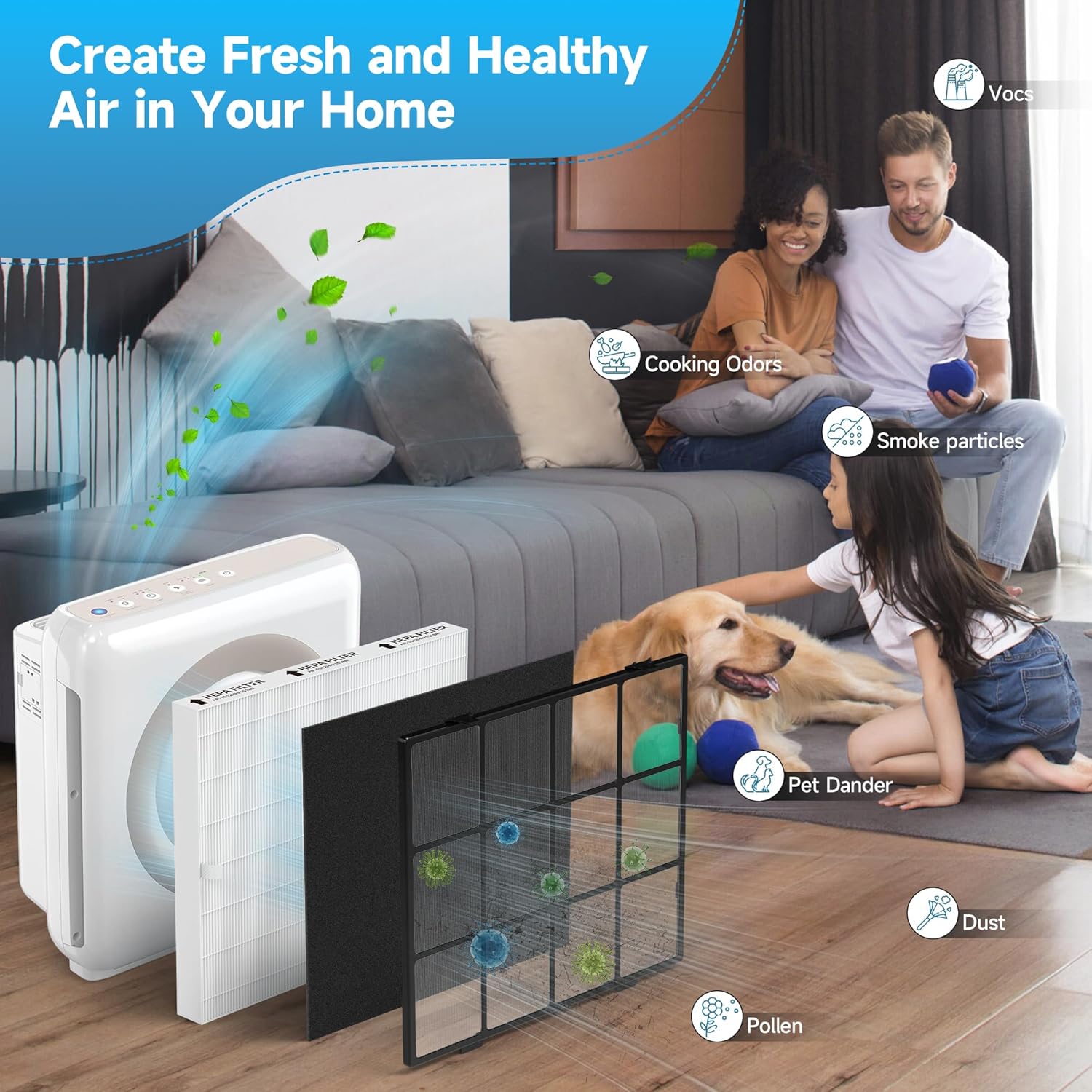 - Advanced Contaminant Removal:Premium filtration (0.03-micron particles) + activated carbon adsorption for household odors (smoke, cooking, pets)