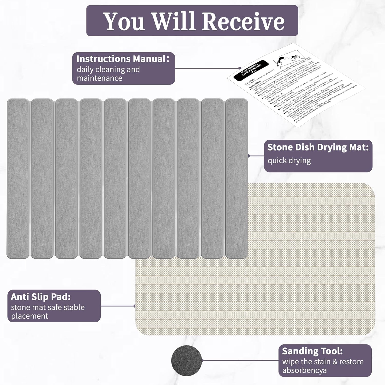 - 【Usage Tip】Avoid spilling dark liquids like coffee or red wine on your stone dish drying mat, as they may cause staining. For regular water marks, simply rinse with water and wipe with a damp cloth before air drying. For stubborn stains, gently sand the area with the included sandpaper or spot-treat with baking soda for quick restoration.