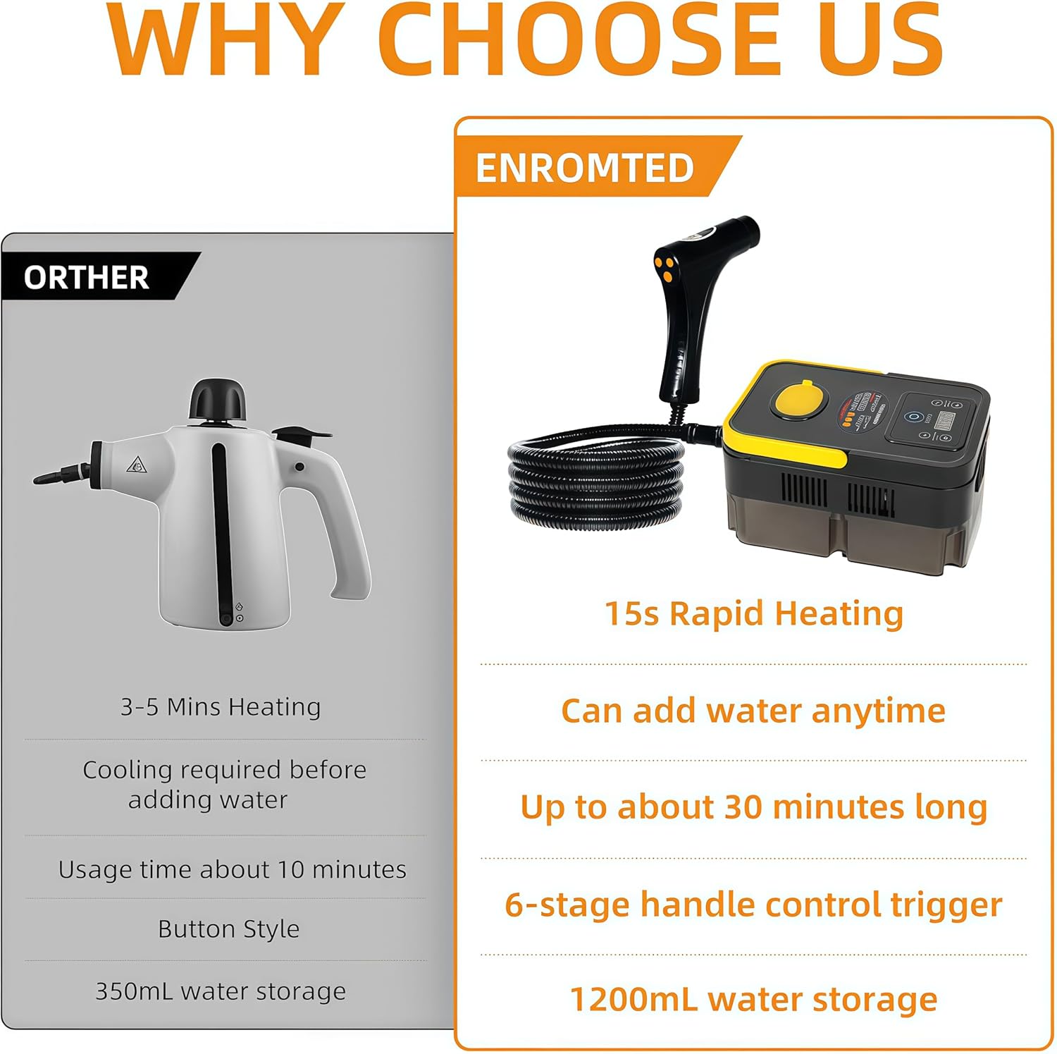 - Enjoy 45–60 minutes of continuous steam cleaning with the extra-large 1200ML tank—no more frequent refilling! Perfect for deep cleaning furniture, car interiors, and tough home stains, this pressurized handheld steam cleaner delivers powerful, long-lasting performance for versatile use anywhere.