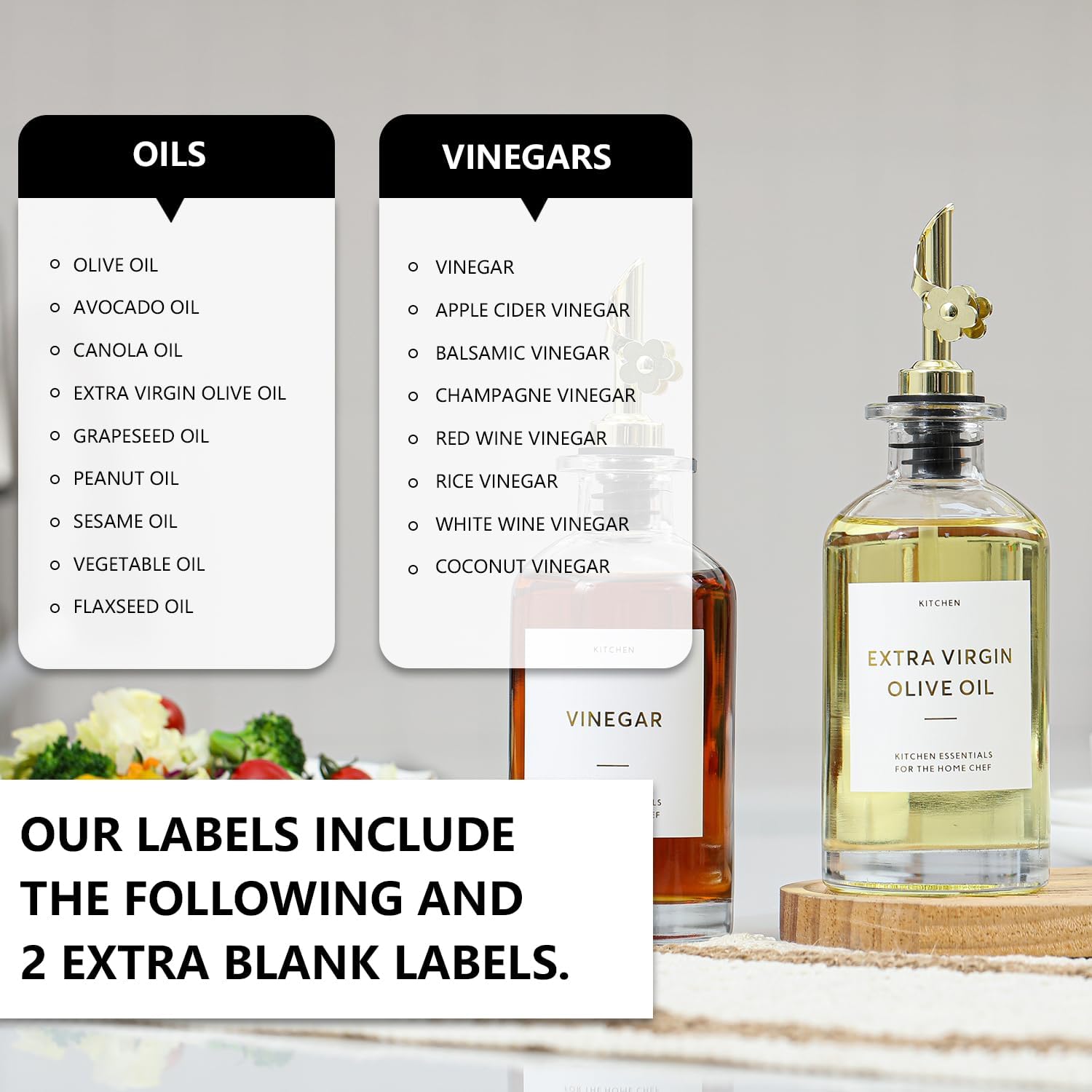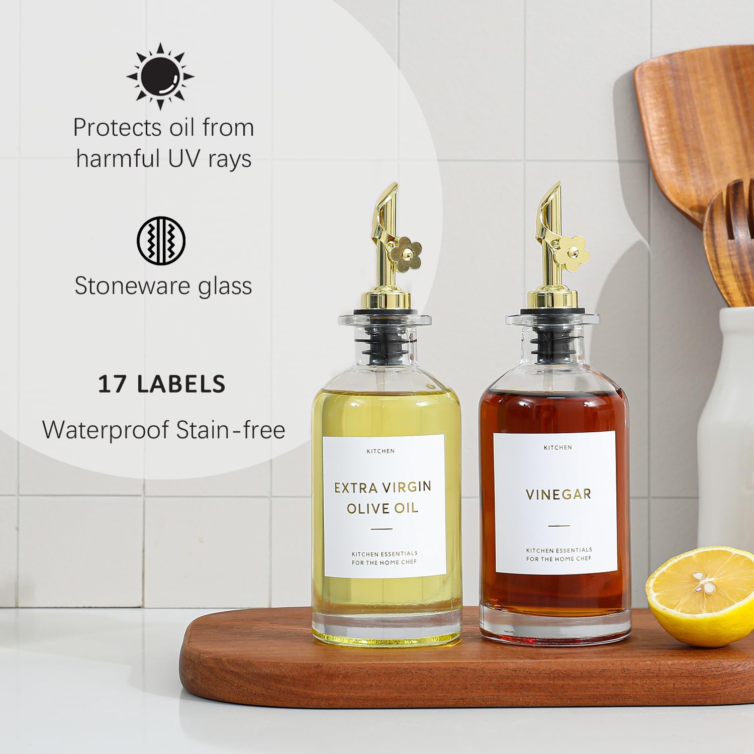 - KITCHEN OLIVE OIL BOTTLES – The oil and vinegar dispenser set contains 2 transparent 11.8oz (350ML) glass bottles, 2 gold stainless steel oil spouts, 17 gold waterproof labels(kinds of oil and vinegar) and a bamboo tray, Ideal for safely store and dispense your olive oil and vinegar.