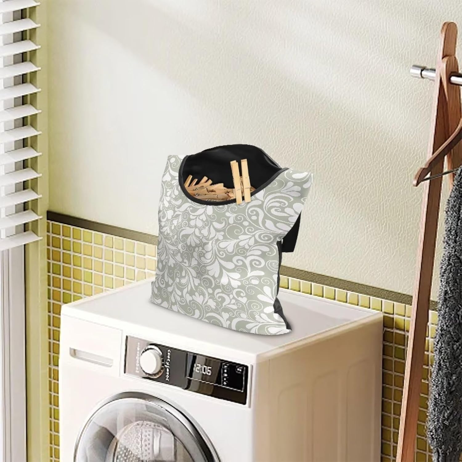 Large Clothespin Storage Bag 14.5"x12" with Oversized Opening - Heart Shape Floral Print Green Heavy Duty Polyester Hanging Organizer for Outdoor Clotheslines with Secure Snap Closure
