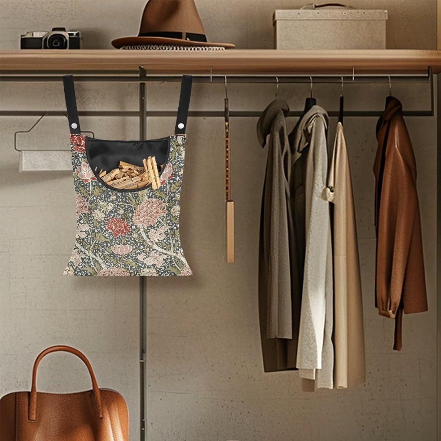 Home Clothespin Organizer 14.5"x12" - Spacious Interior with Wide Mouth Opening - Durable Hanging Storage Solution for Busy Households & Laundry Facilities Hydrangea Tree Branch Print