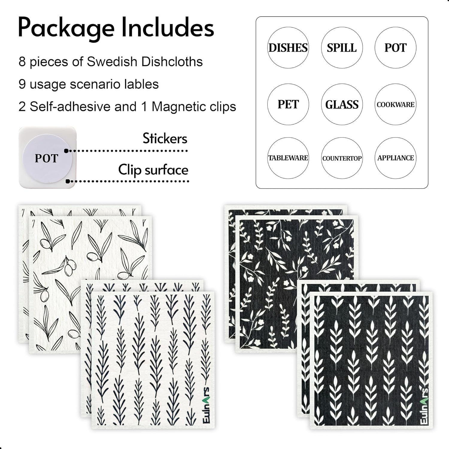 - Easy to Clean and Store: Our swedish dish cloths, measuring 7.8 x 6.8 inches, each set comes with 8 cellulose dish cloths in 4 styles, along with 2 self-adhesive clips, 1 magnetic clip, and 9 labeling tags. Customize storage for easy access, hanging them on walls, counters, or refrigerators to keep your kitchen organized