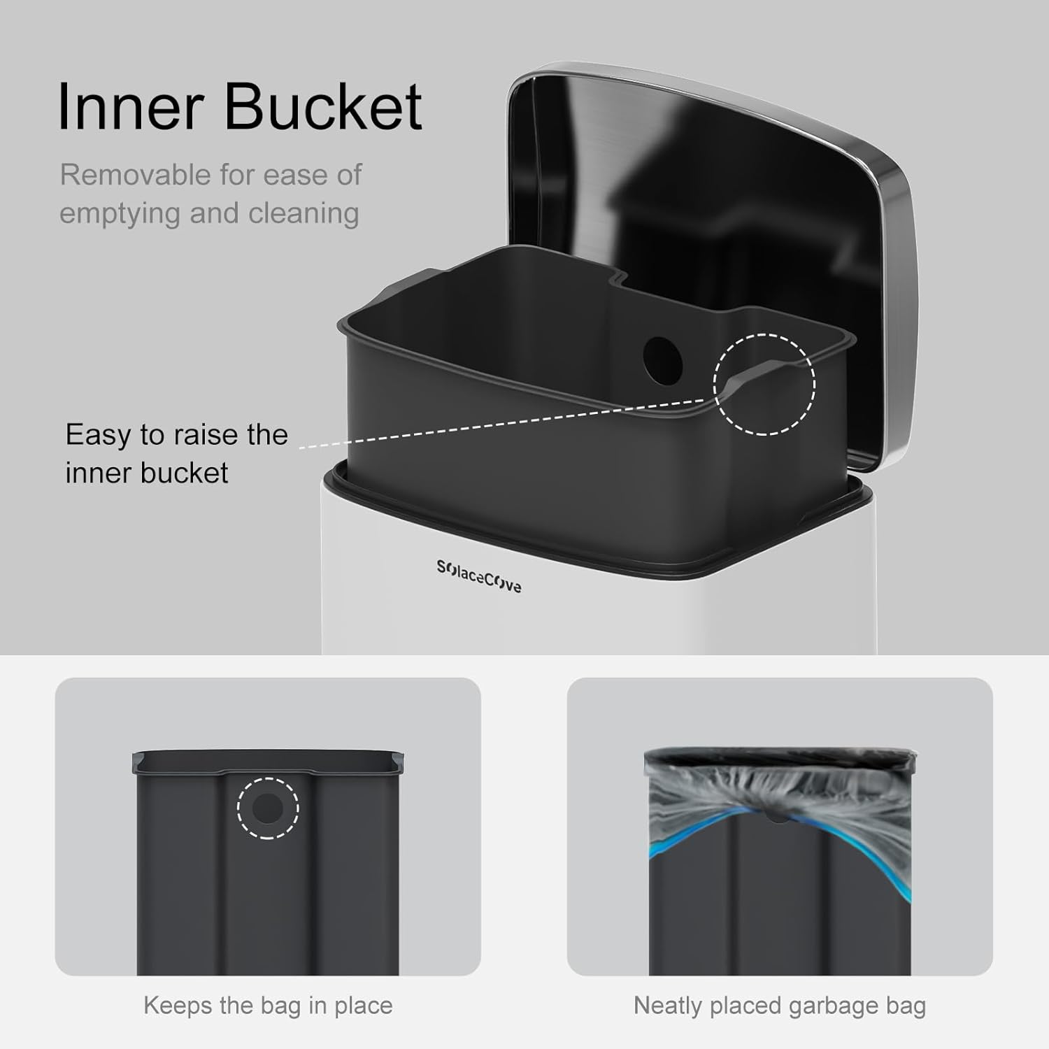 - 【Removable Inner Bucket】The included sturdy plastic inner bucket makes trash removal a breeze while preventing leaks or tears in garbage bags. Simply lift it out for quick and mess-free cleanup.