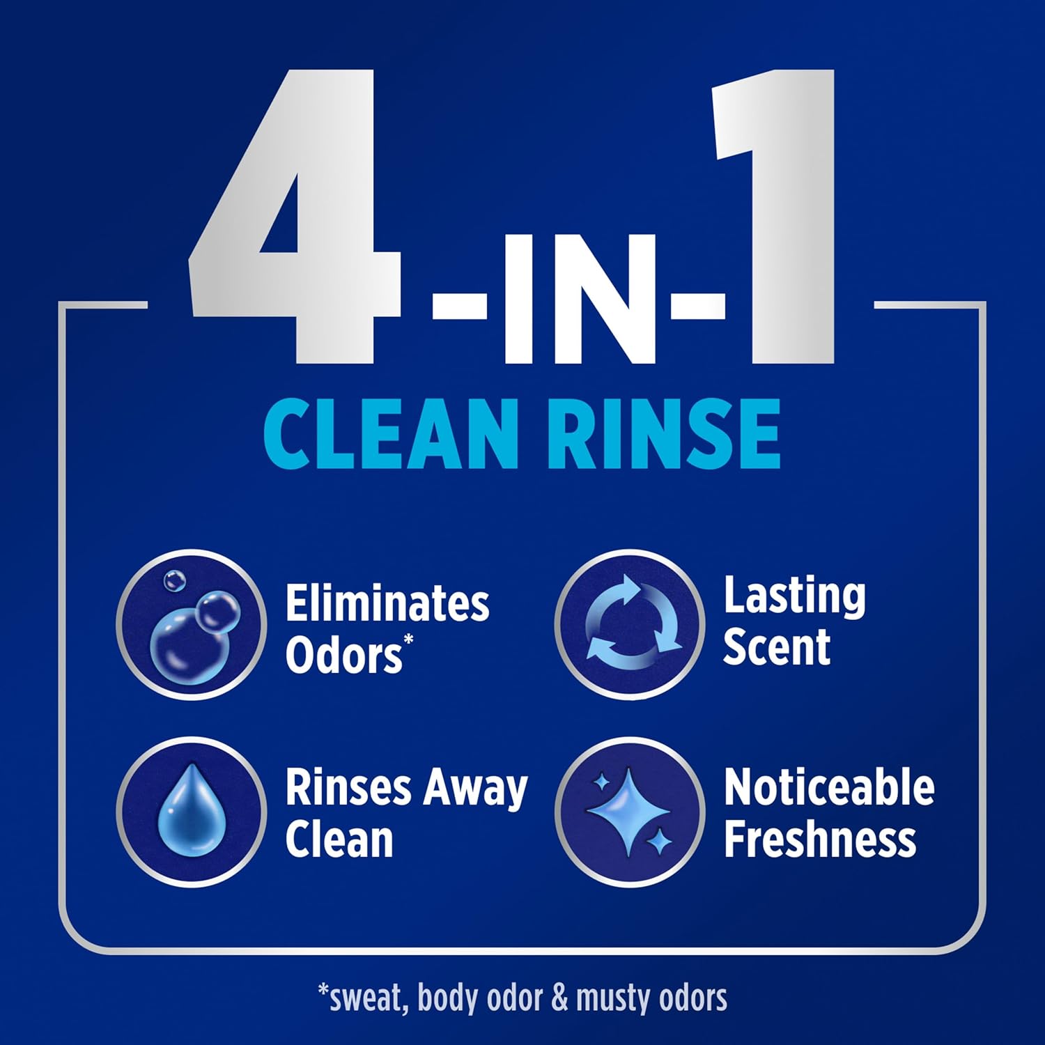 - 4-IN-1 BENEFITS: Laundry rinse with a powerful Clean Rinse formula that eliminates odors*, rinses away clean, and infuses a lasting scent with noticeable freshness (*sweat, body odor, and musty odors)